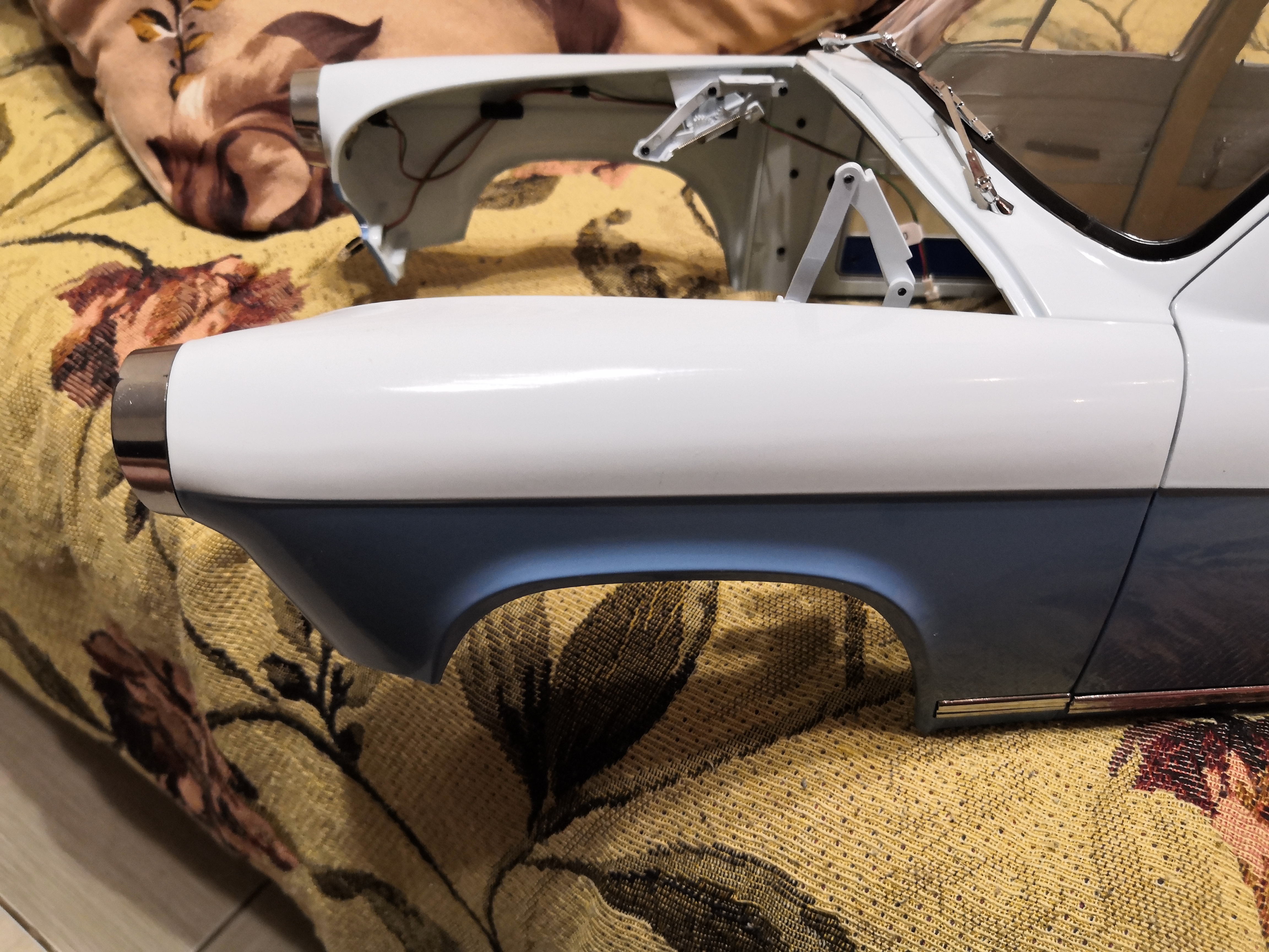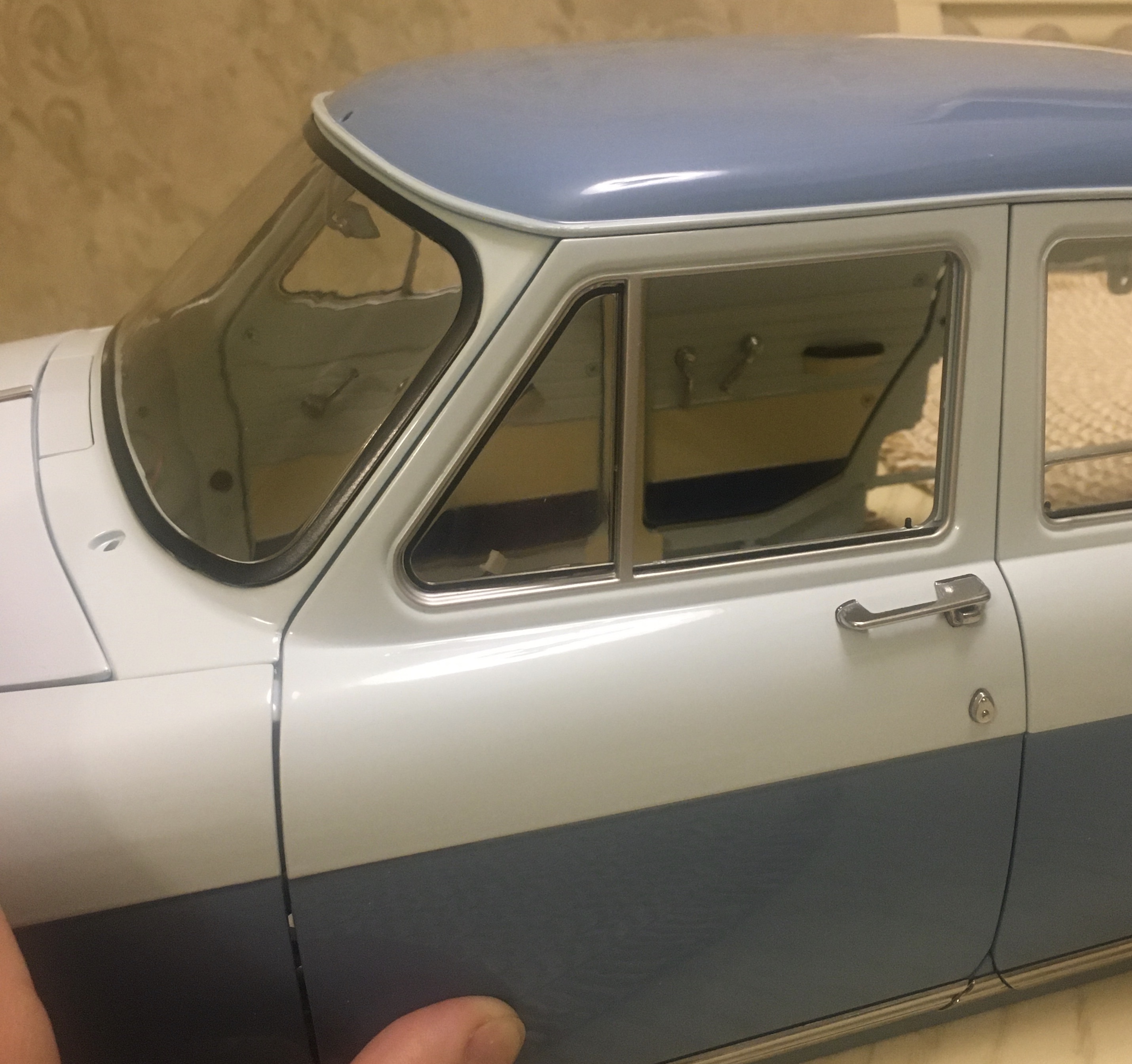 здравствуйте. у меня такая проблема: кривой каркас. ко мне заехал друг, он тоже собирает Волга 21 от Деагостини, и объяснил что к чему. из-за кривизны каркаса передняя водительская дверь не встаёт на своё место. гнуть сам каркас не реально, он из силумина. и сам каркас по диагонали немного качается, как качели, если на него надавить спереди, а потом сзади. ниже представлю фото: