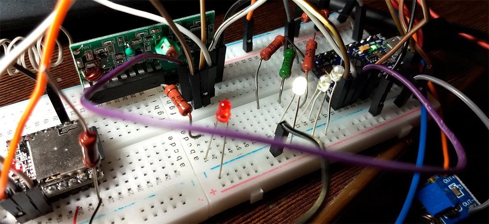 Cхема простая. На плате 5 (плеер не умещался на макетной плате - прикрутил для него посадочный отломок со стороны микро USB ардуино) модулей: модуль заряда аккумуляторов TP4056, преобразователь DC-DC MT3608, приемник беспроводного брелка на 4 канала IC2262/2272, arduino micro pro, DFPlayer. Arduino понимает "высокий сигнал" с 4-x кнопок приемника брелка: зажигает "габариты" кнопкой "A" - (автоматически включается музыка с плеера командой "next"), "D" и "B" моргает "поворотниками", управляет плеером - кнопка "С" - файл с сигналом Волги. На флешку 32 гб можно записать хоть всю домашнюю коллекцию. Все это, кроме аккумулятора, влезло в заднюю спинку сидения. С питанием пока думаю, хотя все прекрасно работает и от BL-4С.