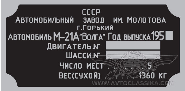 А у Вас на табличке написано "Горьковский автомобильный завод" или "завод им. Молотова г. Горький"? А Волга обозначена как М21А ?