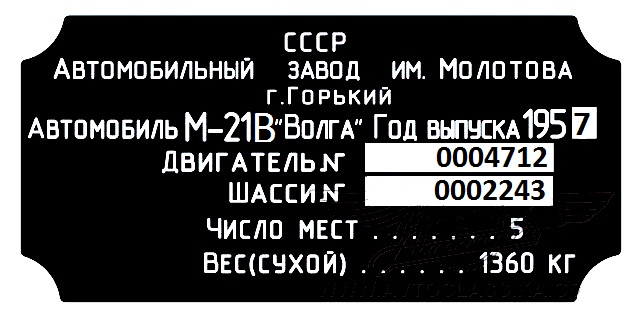 Номера двигателя и шасси основывал на реальной табличке волги 1958 г. в. (отминусовал только несколько сотен). Табличку брал из интернета. Судя по количеству выпущенных моделей первой серии - больше 30 тыс. - мои номера вполне могли быть реальны в конце 58г.