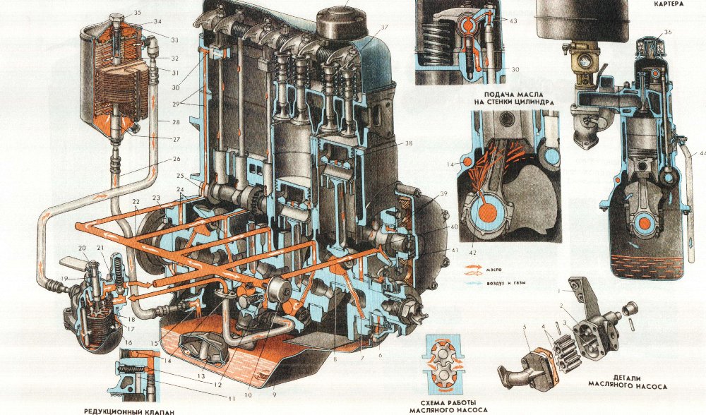 Вот схема: Там, где цифры от 16 до 21 - это фильтр грубой очистки масла и сперва масло поступает именно туда, далее оно фильтруется и по трубке 28 частично попадает в фильтр тонкой очистки. Это алюминиевый цилиндрический корпус с конусом снизу (позиции с 26 по 28 и с 31 по 35), внутри и находится многослойный фильтр ( о нём я говорил ранее) из картонных пластин. Там масло ещё лучше фильтруется и по трубке 26 поступает обратно в картер мотора. Датчик давления масла на схеме имеет номер 10.