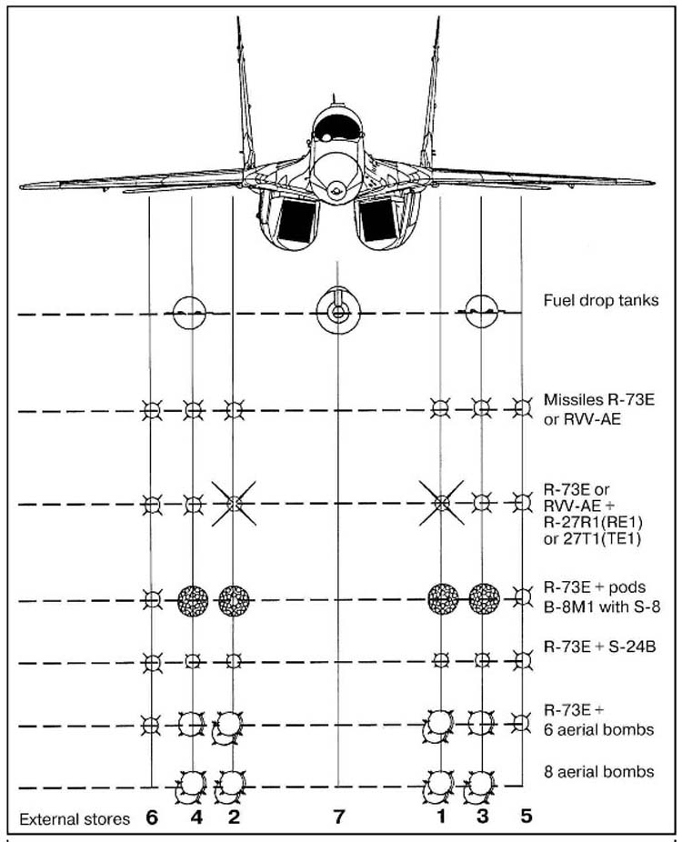 4. Схема обвеса для какой модификации выложена? Позволю себе добавить найденную мной схему. На достоверность не претендую, а выкладываю на суд, если есть аргументированные возражения против предоставленной схемы, то всегда рад услышать знающих товарищей. Схема стырена из книги "МИГ 29" Е. Гордон, А. Фомин, А. Михеев
