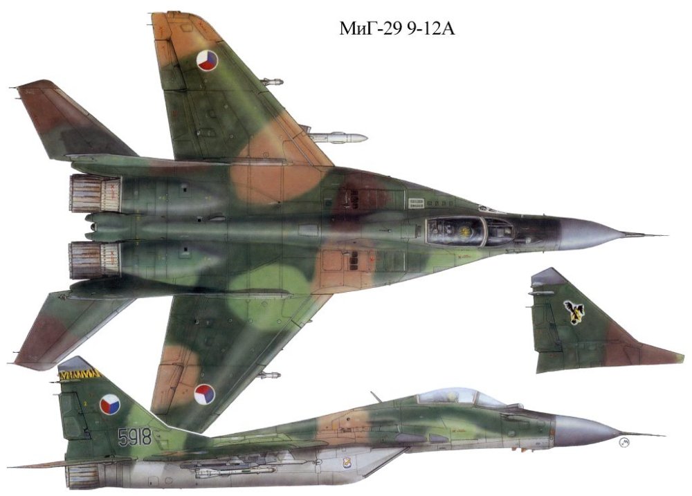 МиГ-29 9-12А зав. №12960532359, 1 эскадрилья 11 ИАП, 3 дивизии ПВО, авиабаза Жатец, Чехословакия 1992. Вооружение поставленных Чехословакии самолётов с помощью спорных доводов было уменьшено до одной ракеты Р-27Р и двух Р-60МК. С 19 по 26 марта 1990 г. самолёт прошёл сдаточные испытания на заводе изготовителя (7.44 лётных часов и 11 посадок), 29.3.90 подготовлен к перелёту. На испытательном аэродроме приземлился 17.4.90 после перегонного полёта 2 ч. 40 мин. Чехословацкие опознавательные знаки (неправильно ориентированные) и бортовой номер, состоящий из последних двух цифр заводского номера (59) и двух - число поставленных самолётов (18), нанесены заводом изготовителем, 10.5.90 года проведён приёмочный полёт в строевой части (лётчик Вашек и техник Нешпор).