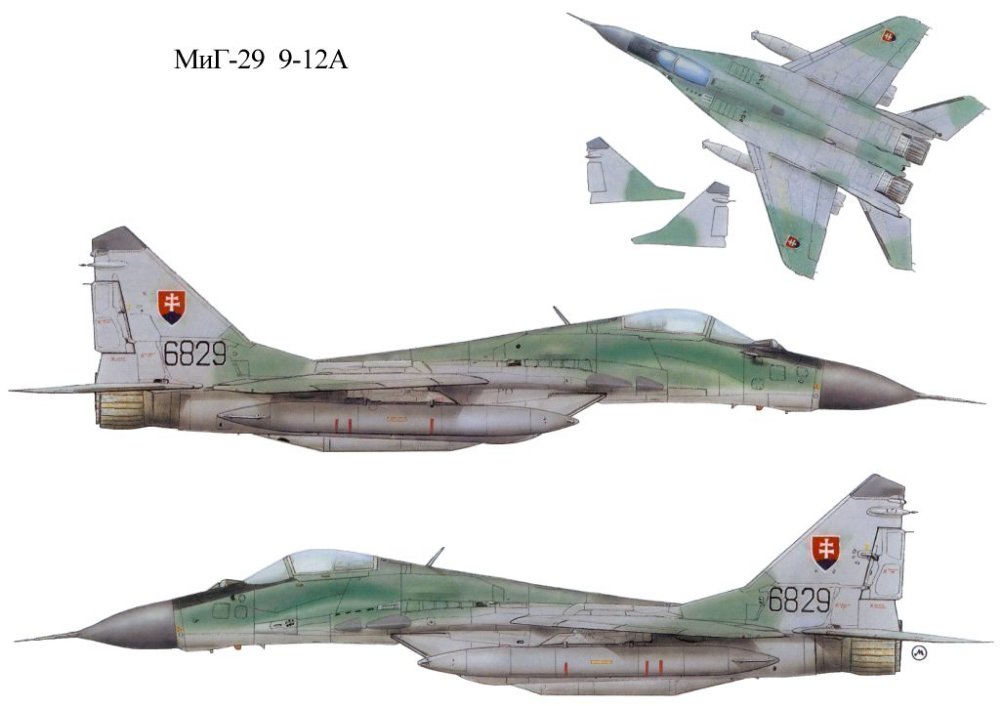МиГ-29 9-12А, зав. № 2960536068 - Словацкая республика, 2 эскадрилья 31 истребительного авиакрыла, авиабаза Шляч, осень 1996. Представленный самолёт изготовлен в марте 1996 с доработанной электроникой (антенна впереди внизу) и может нести подкрыльевые топливные баки. Опознавательные русские звёзды закрашены серо-зеленой краской.