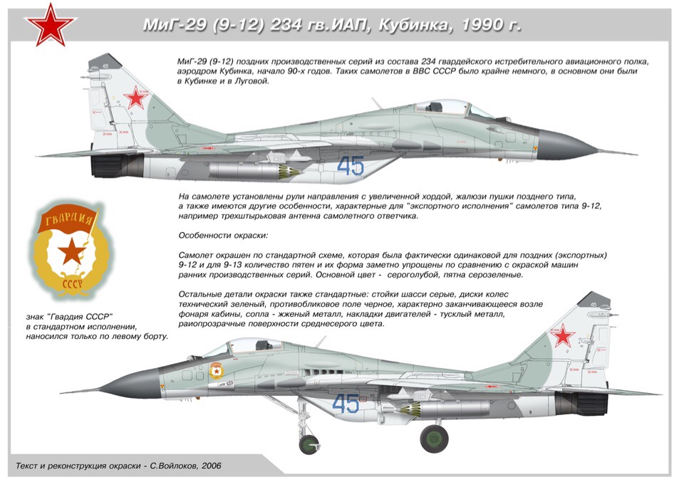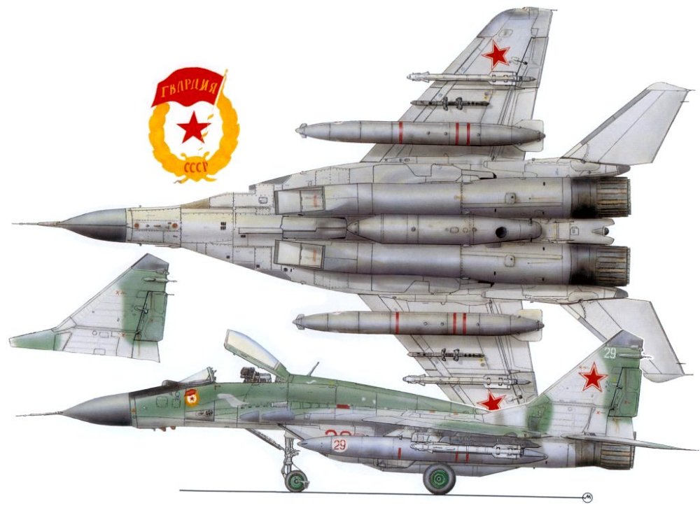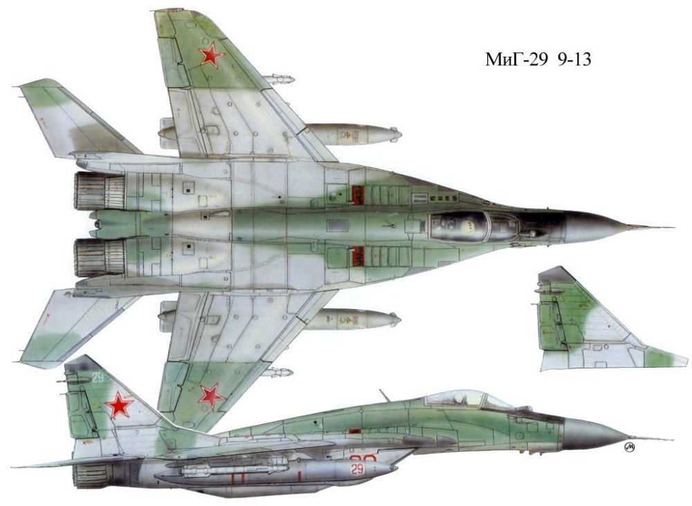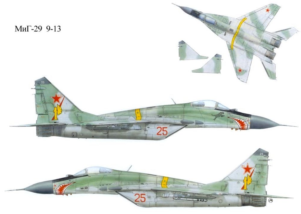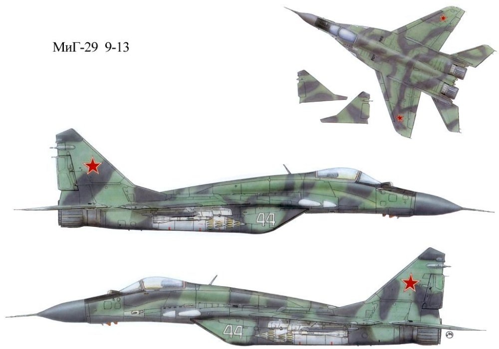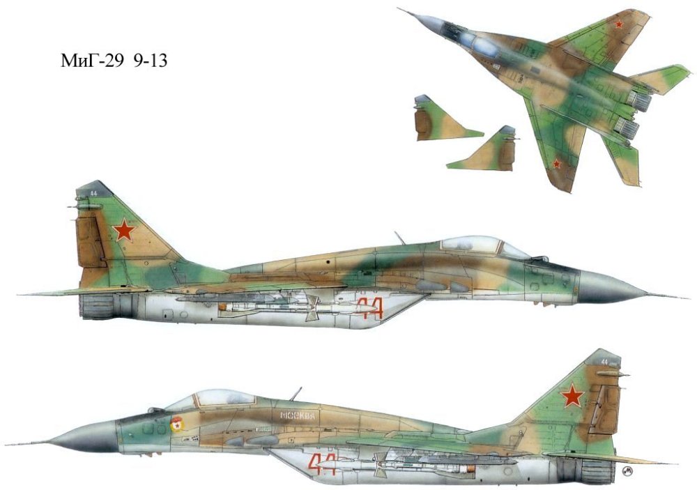 МиГ-29 9-13 - ВВС СССР, 2 эскадрилья "Москва", 115 ГвИАП, база около города Термез, близ афганской границы, Узбекистан 1990. Оттенки коричневых и зелёных полей - разные (выгорели на солнце). Под кабиной гвардейский знак. Вооружение: 2хМиГ-29 9-13 - ВВС СССР, 2 эскадрилья "Москва", 115 ГвИАП, база около города Термез, близ афганской границы, Узбекистан 1990. Оттенки коричневых и зелёных полей - разные (выгорели на солнце). Под кабиной гвардейский знак. Вооружение: 2хР-27Р, 2хР-60М.Р-27Р, 2хР-60М.