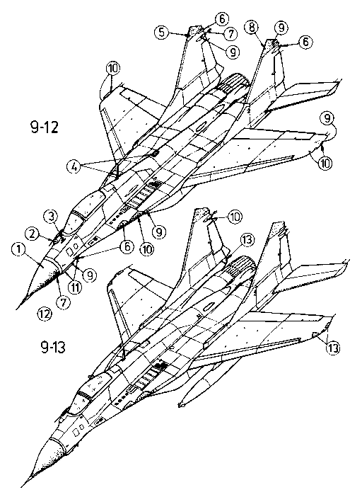 Размещение антенн радиотехнических и электронных систем на самолёте 9-12 и отличия от 9-13