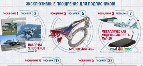 В случае выбора премиального предложения с выпусков 1, 2, 4, 7 Подписчик будет оплачивать дополнительно 59 рублей за каждый выпуск, начиная с выпуска № 7 и получит дополнительные поощрения - 5 моделей самолетов с выпусками 38, 54, 70, 86, 110.
