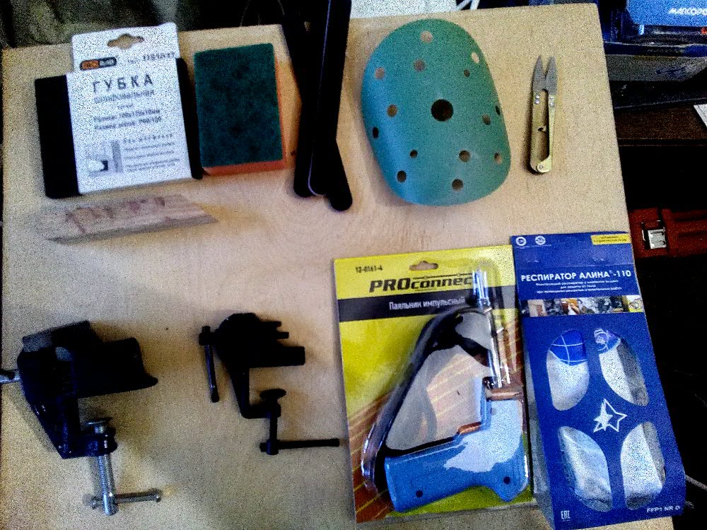 Господин AZET как то совсем упустил шлифовальные материалы. Очень удобны одноразовые пилочки для маникюра. Губка кухонная показана из-за нетканого абразивного материала. Он продается отдельно, но у нас его нет. Поэтому использую кухонные губки. Очень удобны ножнички показанные справа. Но некоторые используют для обрезки ниток кусачки для ногтей. Ну тиски и паяльник понятное дело. А вот при малковке и шлифовке надо не забывать использовать респиратор.