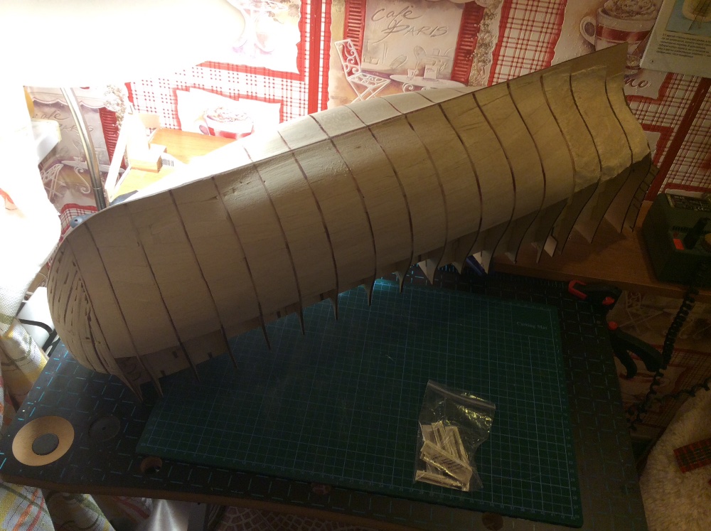 Несколько последних шпангоутов склеивал под сильным прессом - по ним шпации все четкие, не веденые. Надо было все шпангоуты так склеивать. Совет на будущее :D