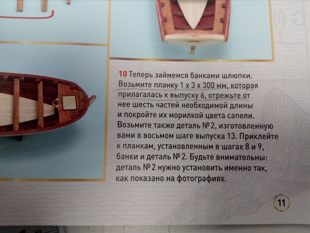 С выпуском №6 приходит только одна рейка. Тут,похоже, производитель ошибся с комплектацией -для следующей шлюпки он присылает сразу 3 таких рейки. Правда, придут они только с выпуском №49. При желании можно склеить банки из обрезков шпона 0,5х3 мм.