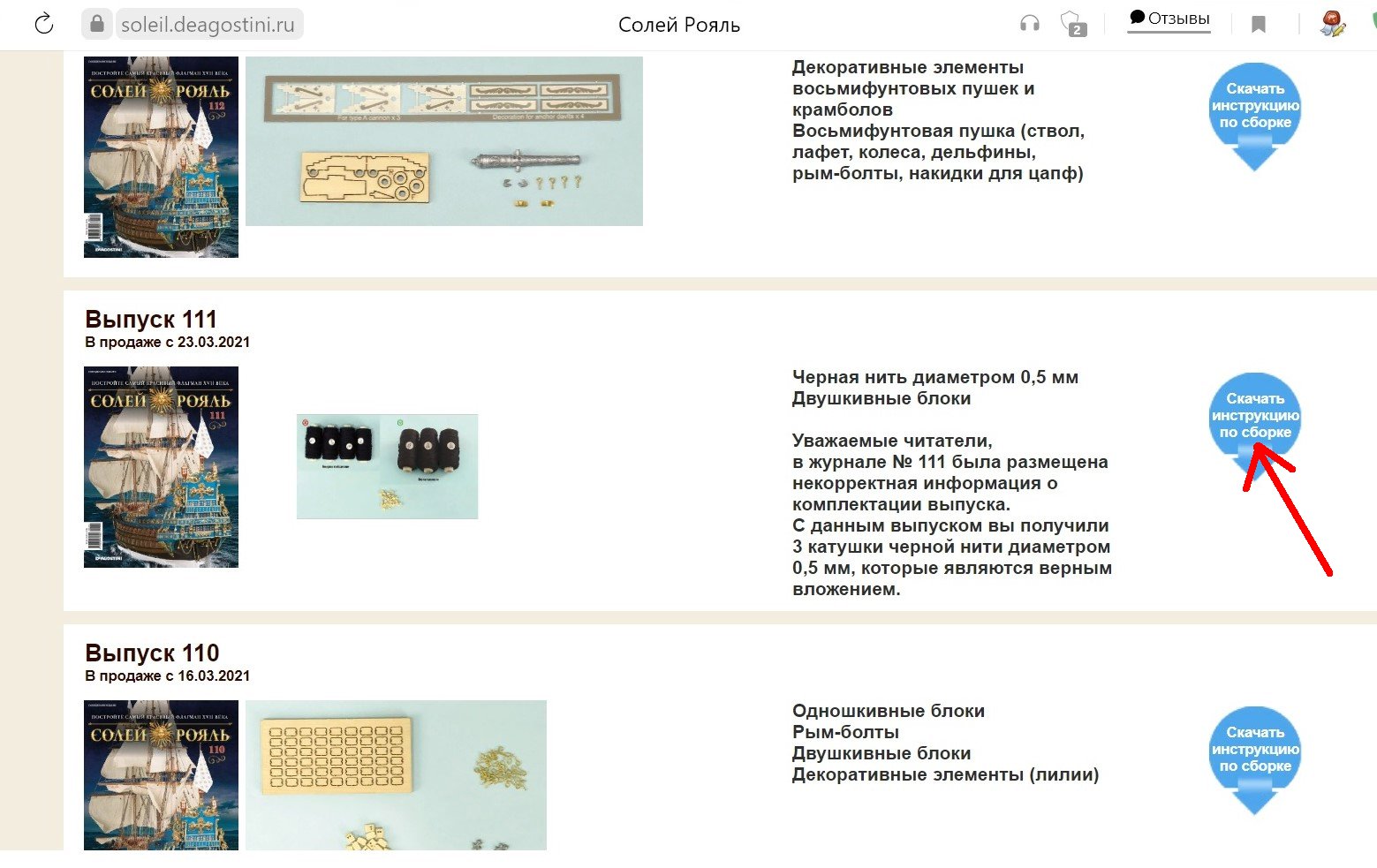 1. При нажатии на кнопку журнала №111 (на фото ниже отмечена красной стрелкой) ссылка ведет на инструкцию по сборке из журнала №110!