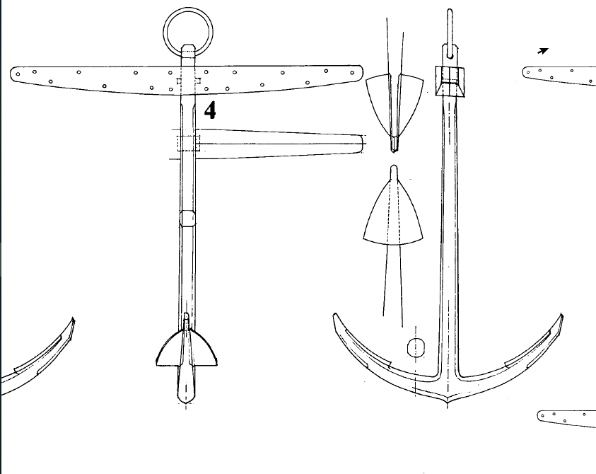 Доброе утро! Решил написать несколько мыслей по поводу якорей на нашем корабле. Перелистав несколько книг от издательства Ancre "Корабли короля Солнце", "Монография адмирала Трувиля" с чертежами 3-х дечного парусника Ambitieux (1691),чертежи корабля Belle (1680г), чертежи корабля 5-го ранга (1683г) и чертежи более позднего корабля Le Fleuron (Цветок) 1729г, а так же почитав книгу Скрягина "Якоря" сделал для себя вывод, что наш якорь должен быть, как на корабле Ambitieux (1691) изображение его приводили выше