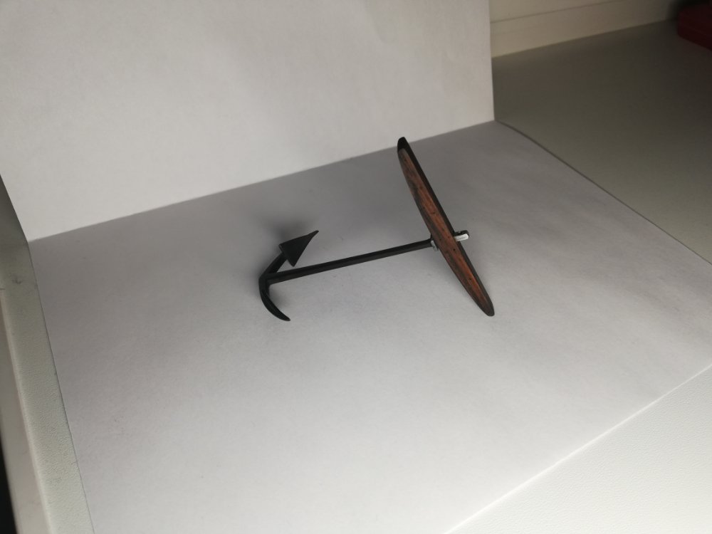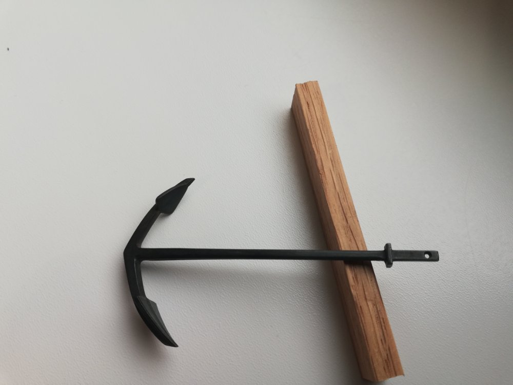 Для себя решил пока оставить якорь из набора, занялся штоком. Шток согласно историческим изображениям состоял из двух половин, в качестве крепежа использовались болты (гвозди с обратным шипом), решил вырезать новый шток из двух реек. В качестве материала для штоков якорей обычно использовали дуб, поэтому решил попробовать вырезать из дубовых реек, прекрасно понимая, что дальнейшая тонировка проявит всю структуру этой не сильно подходящей древесины (для такого масштаба) Ну как говорят плохой опыт, то же опыт. Жду критических замечаний по материалу и цвету штока.