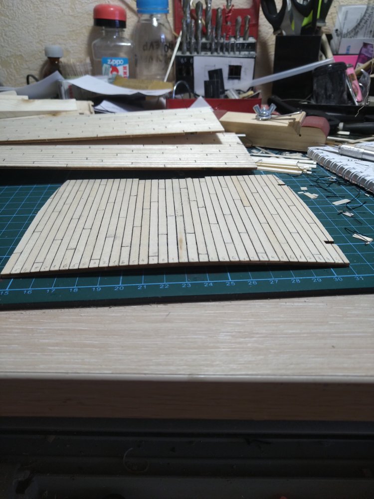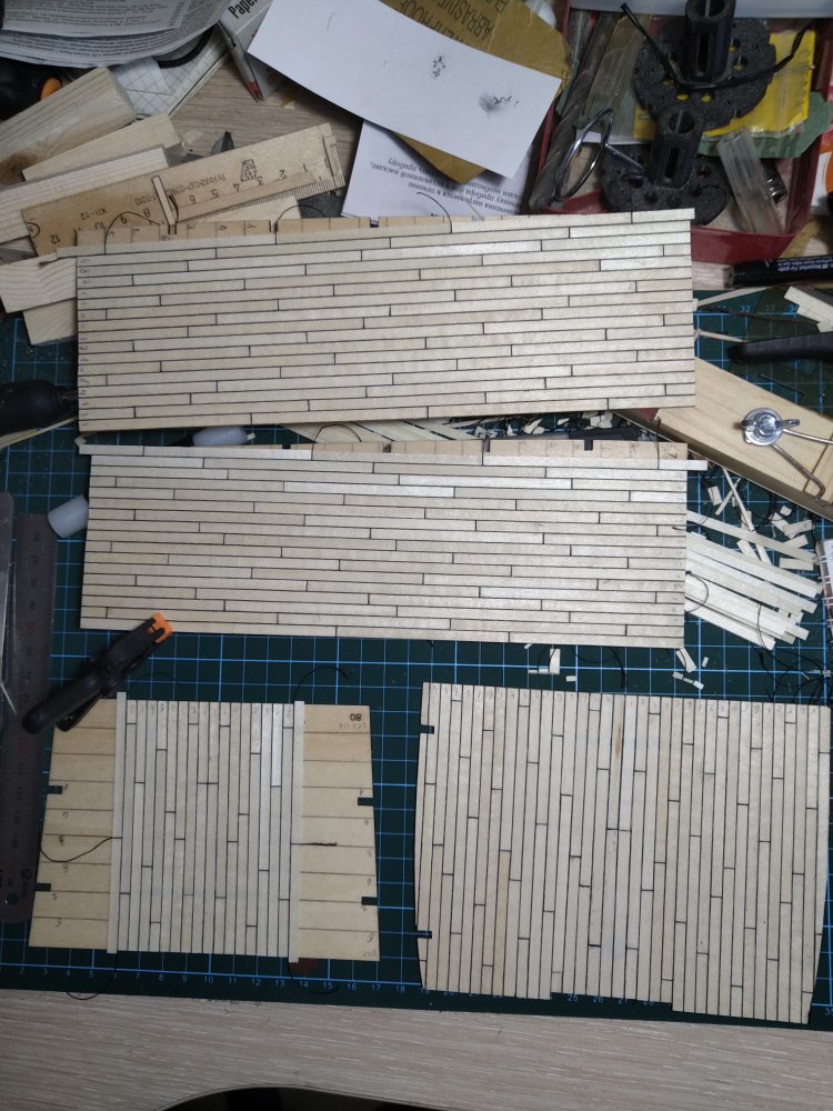 Палубы жутко изведены. Но надеюсь, что когда приклею их к бимсам, кривизна уйдет. Погибь решил не делать, боюсь испортить.