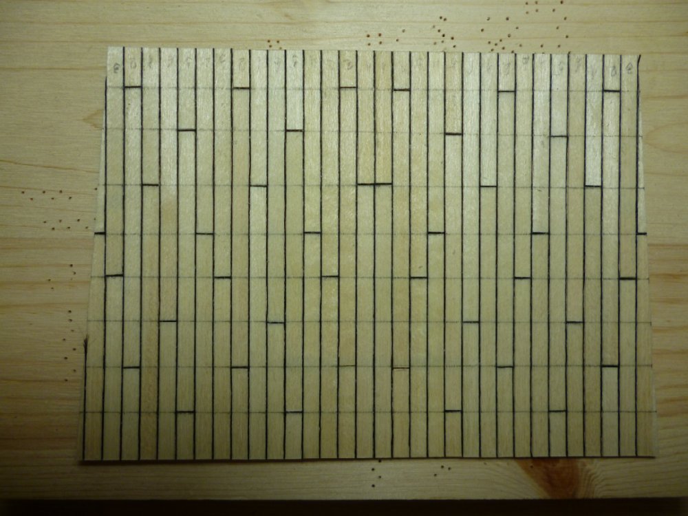 А сейчас полным ходом идет работа над палубами. Длину доски выбрал 7 см. На мой взгляд лучше смотрится, хотя и не по масштабу. Имитацию конопатки делаю черной ниткой. И не решил пока с гвоздеванием. Решу после укладки настила палуб.