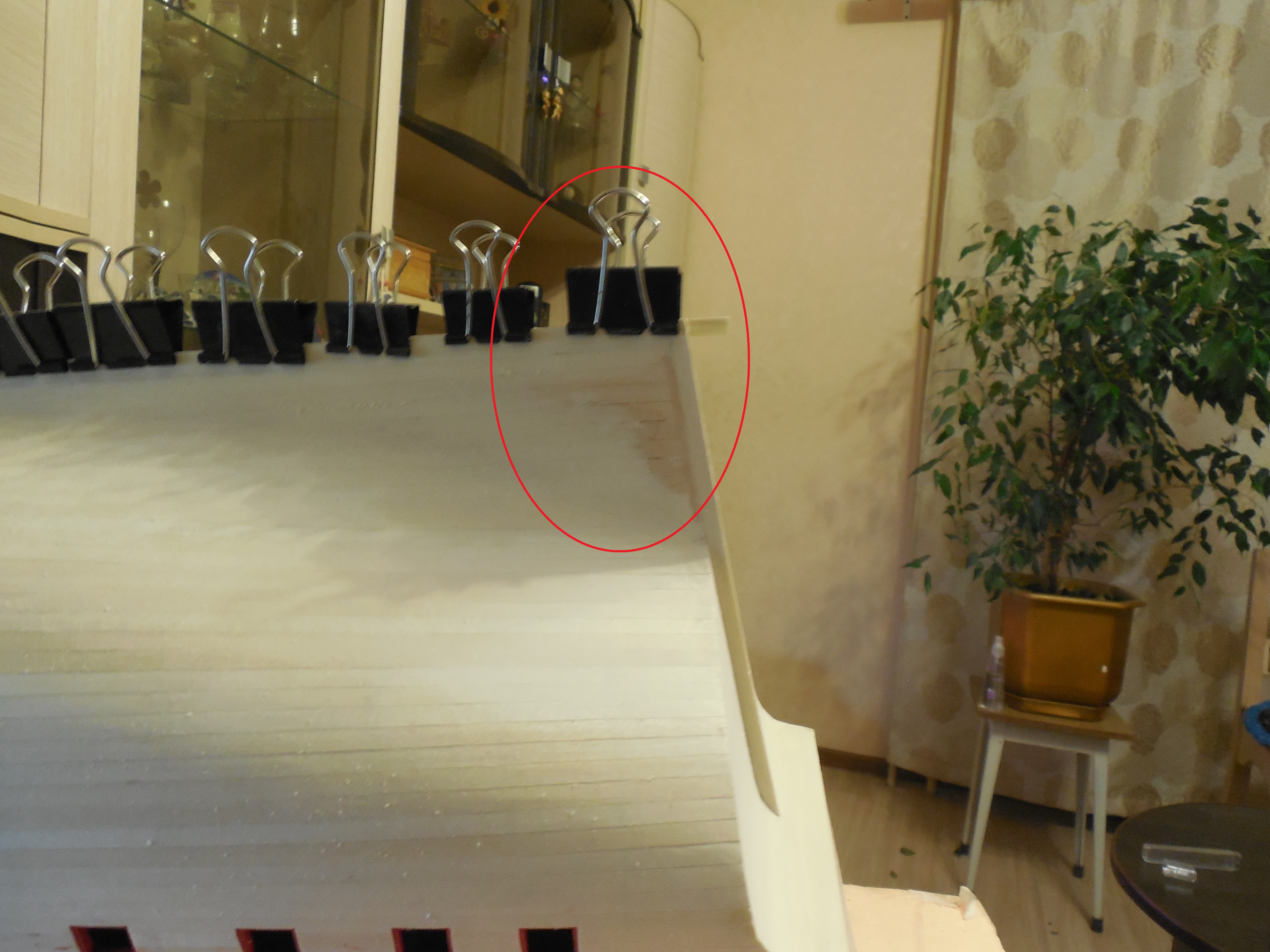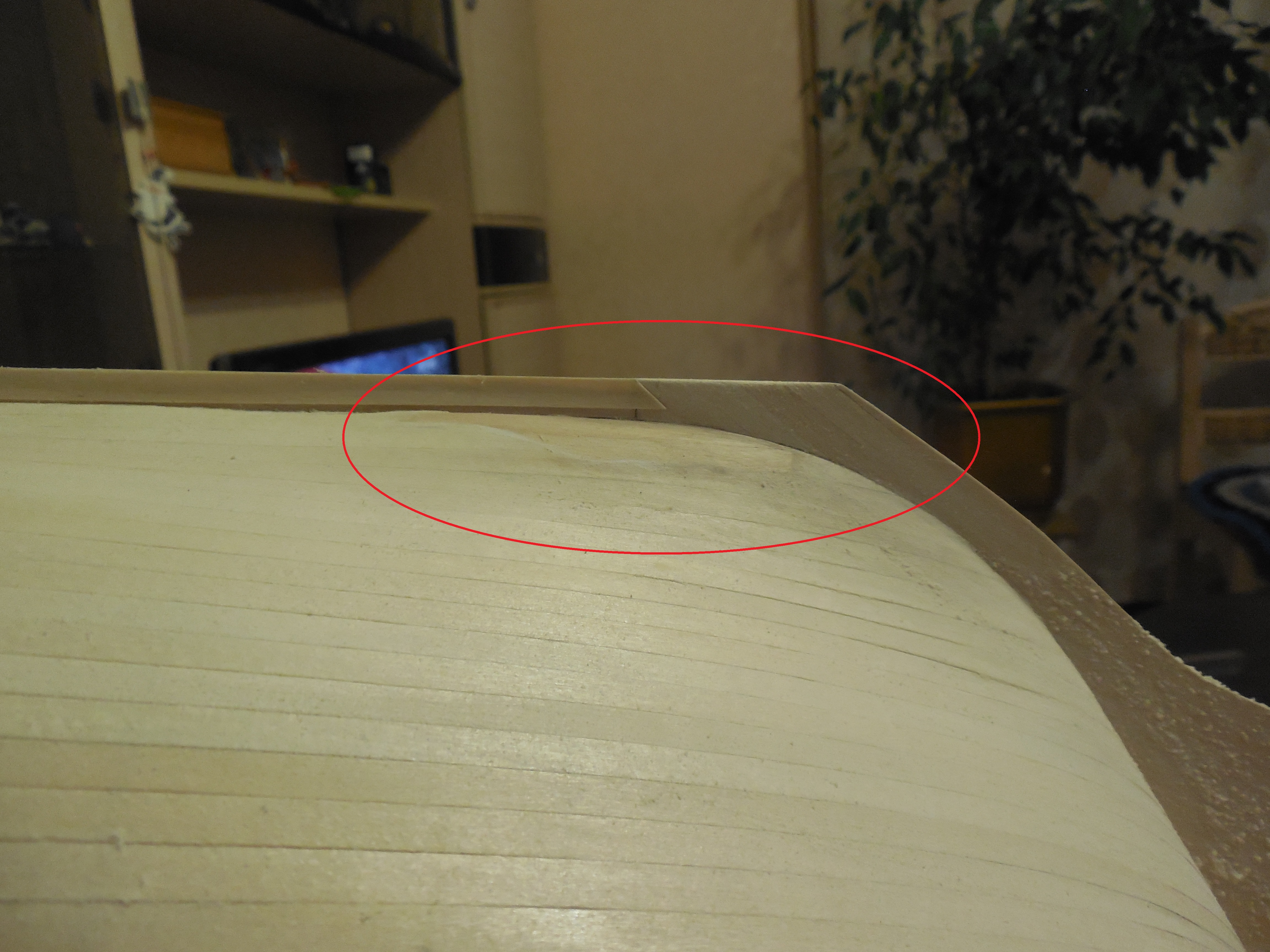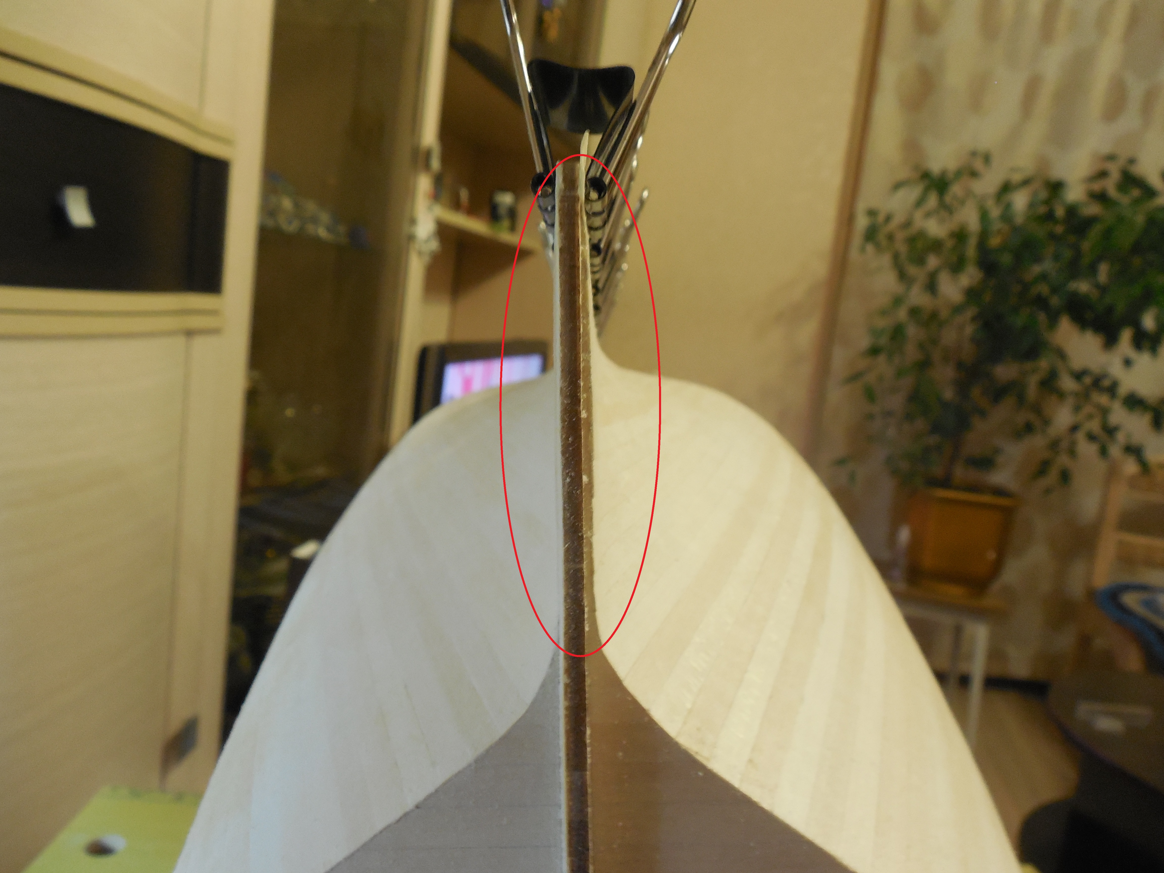 Я сделал слишком толстый край, куда приклеивается ахтерштевень. Пришлось стачивать. Сточилась вся чистовая обшивка. Так же в носовой части. Вот это я лоханулся