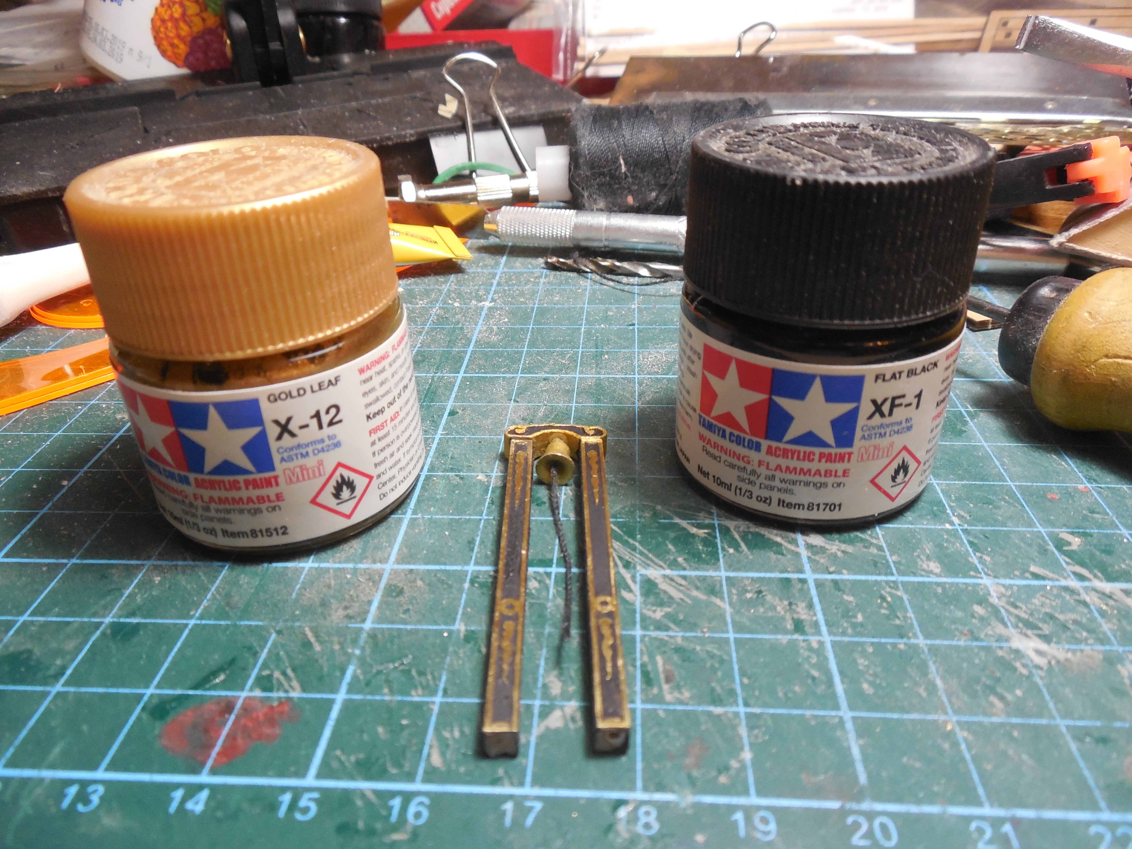 Изготовил релинги фордека. Первый столбик обклеил обрезками планок обшивки, чтобы он в травленке не болтался, как карандаш в стакане. Латунь покрасил золотой краской, чтобы было в тон перилам. Ну и результат на фото