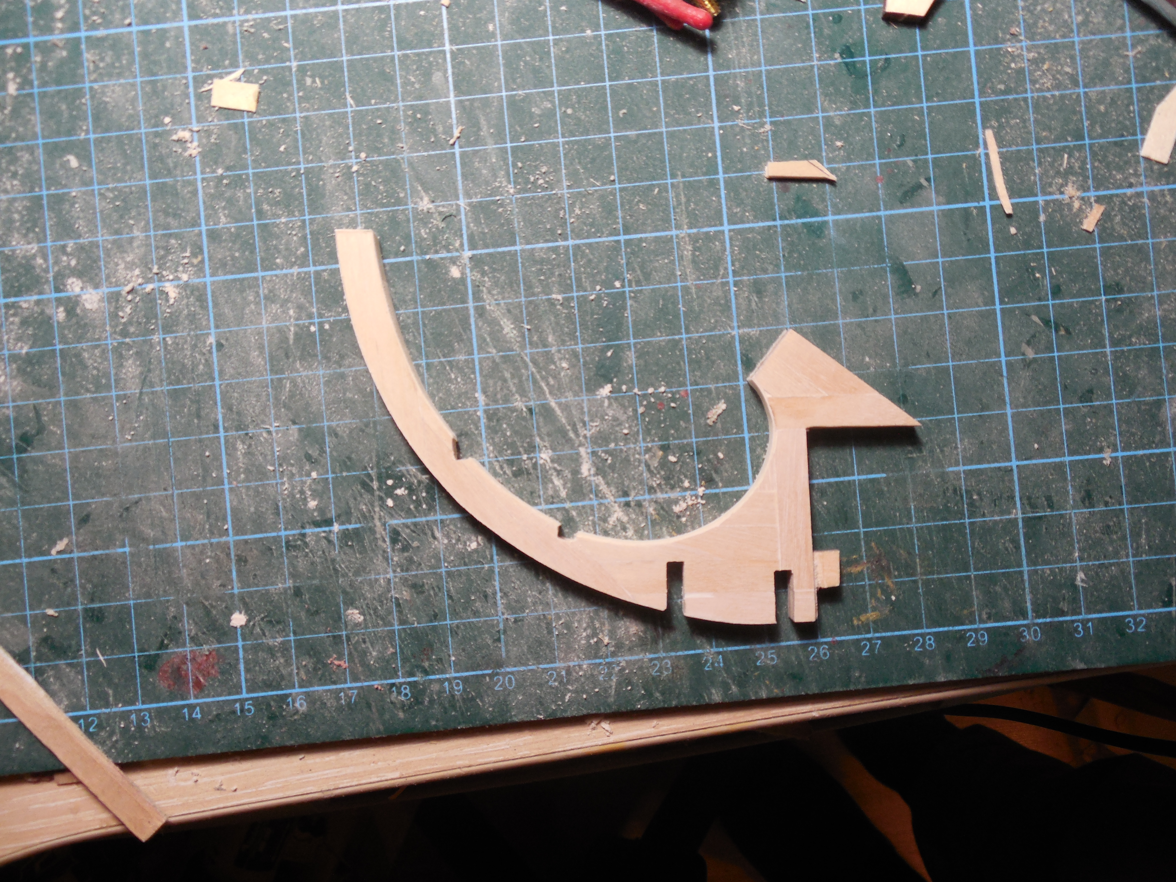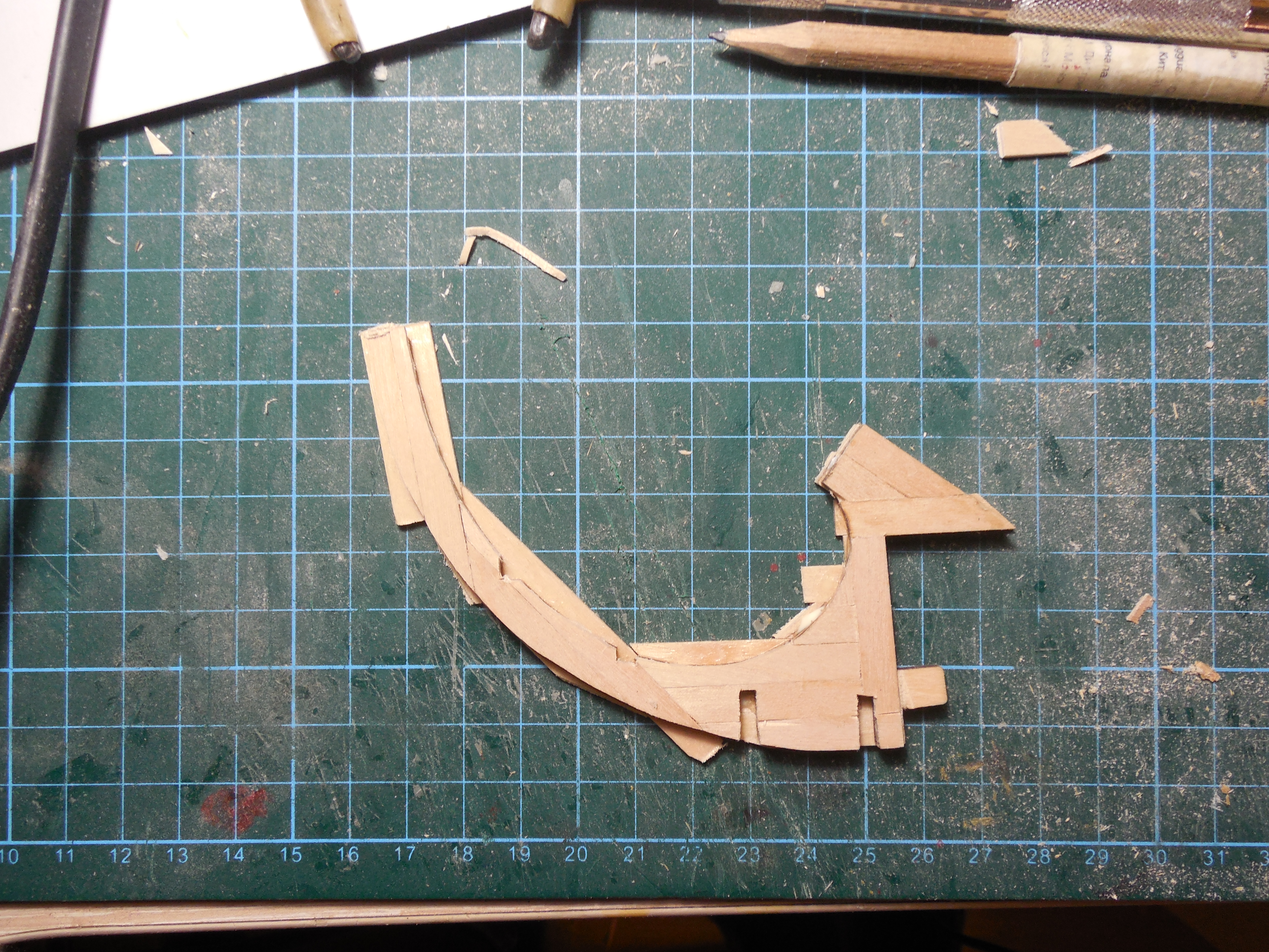 . И гед-тимберсы сделаны под эти рейки. Отдирать старые планки уже опасно, т.к. надо будет переворачивать и вертеть туда-сюда корпус и можно переломать релинги бортов. Пришлось положить еще по два слоя чистовой обшивки скаждой стороны на штевни, княвдигед, киль и обшивку в кормовой части. Шлифовкой довел до нужной толщины. Те, кто еще не дошел до этого этапа, учтите это. Зашил вторую часть княвдигеда, зашлифовал и торец заклеил планкой чистовой обшивки, чтобы скрыть слои фанеры. Не спрашивайте, почему именно так расположил рейки на княвдигеде, ибо объяснение одно - я художник, я так вижу