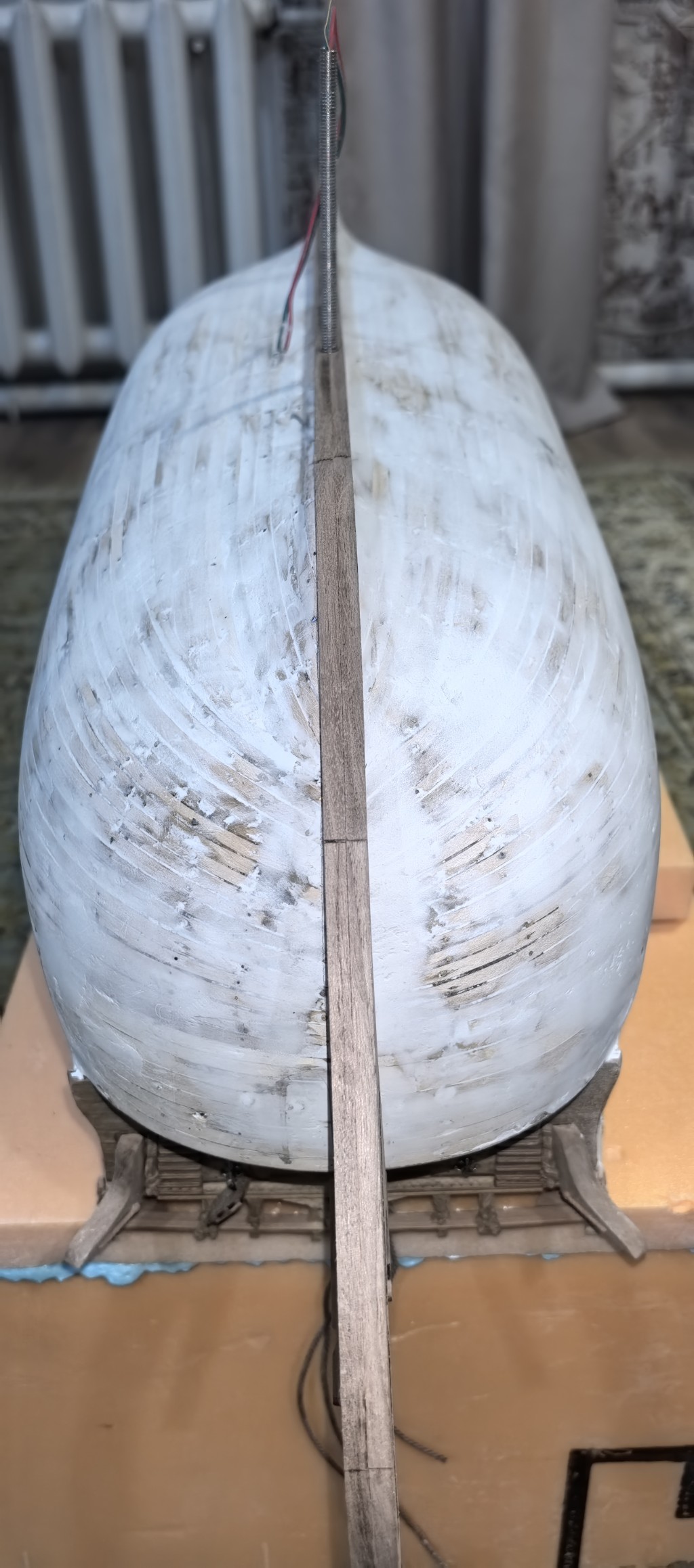 Хочу напомнить, шлифовать нужно не просто пальцами, зажав в них шкурку. Пальцы будут отшлифовывать ямы в мягких слоях дерева, а шкурка нанесенная на гибкий или жесткий брусок, а вот контролировать результат всегда голой рукой. Правильные и плавные обводы корпуса модели корабля достигаются именно тщательным шлифованием. Шлифовал по диагонали под углом к волокнам или рейкам, избегал шлифовку строго вдоль одной линии, чтобы не нарезать канавы.