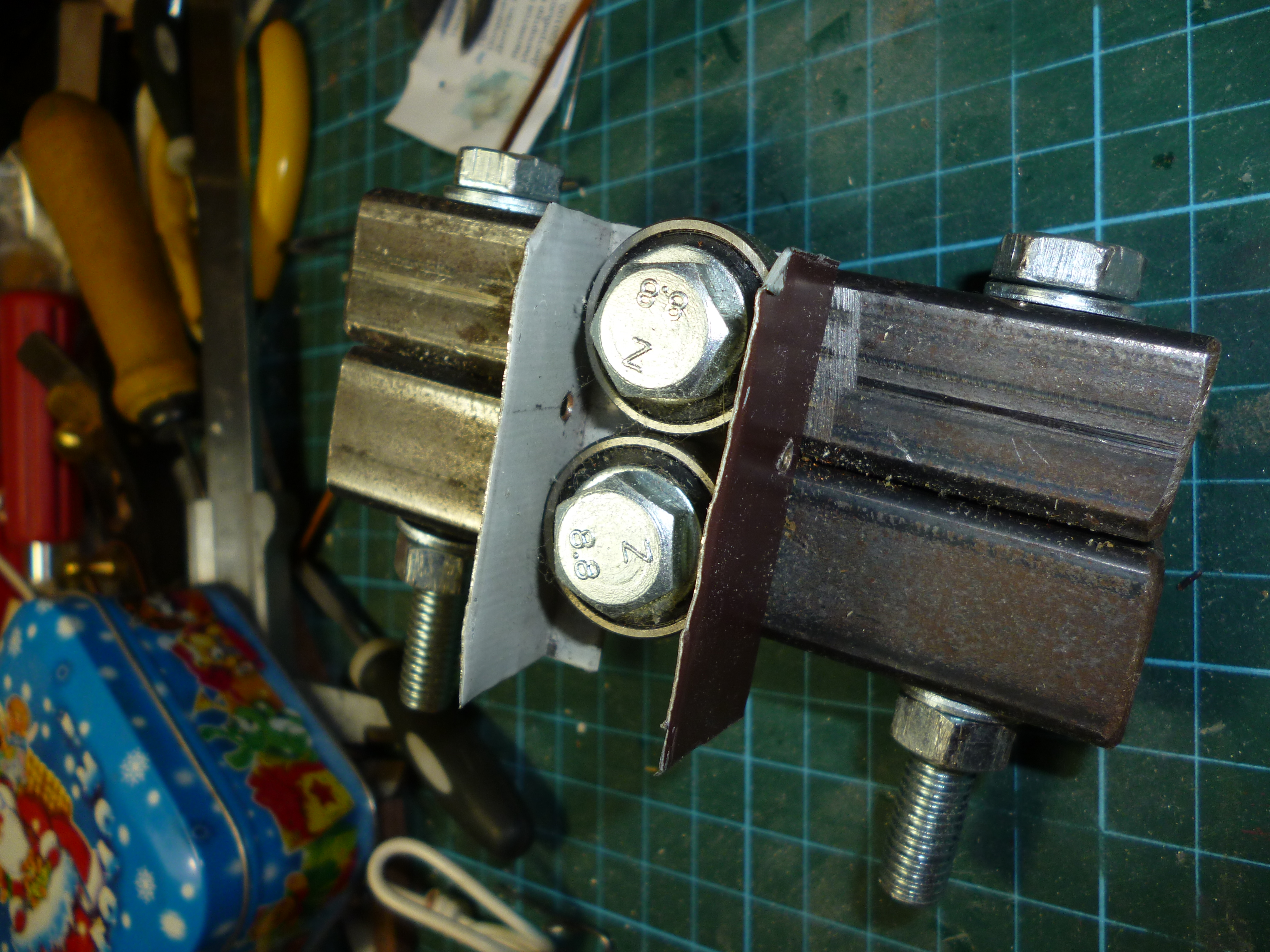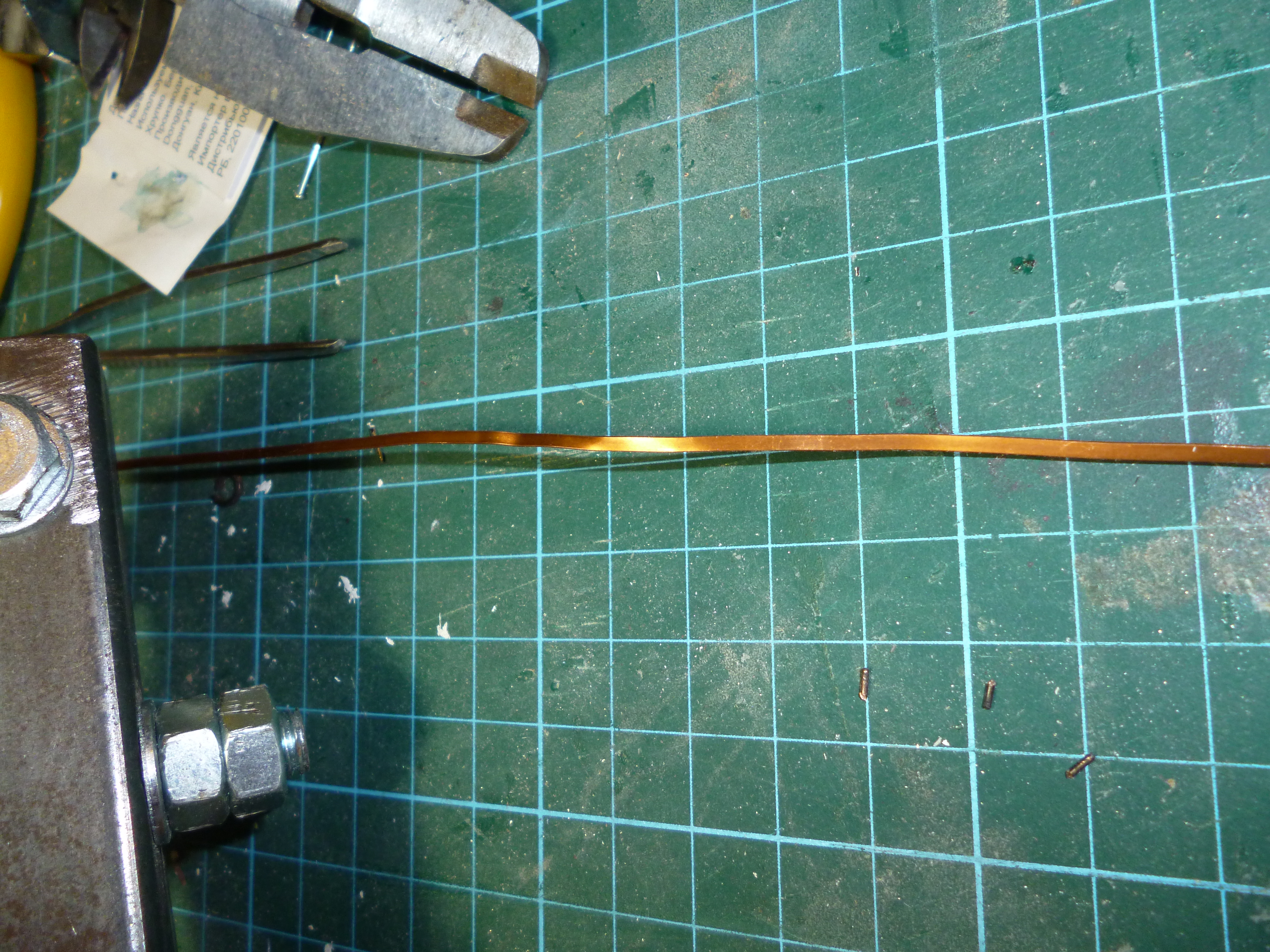 . А вот полоску для бугелей уже заготовил. Делал при помощи самодельных вальцов из медной проволоки 1,4 мм диаметром. Конструкция вальцов проста - два подшипника на квадратном профиле и направляющая. Вставляем проволоку через направляющую и подшипники, потом стягиваем болтами, чтобы проволока сплющилась между подшипниками. И тянем плоскогубцами. Протягивать через вальцы надо несколько раз, т.к. за один раз такой тонкой не получится. Ну и потом еще немного наждачкой. Получилась полоса шириной 2мм и толщиной 0,4. Примерил, вроде нормально смотреться должно.