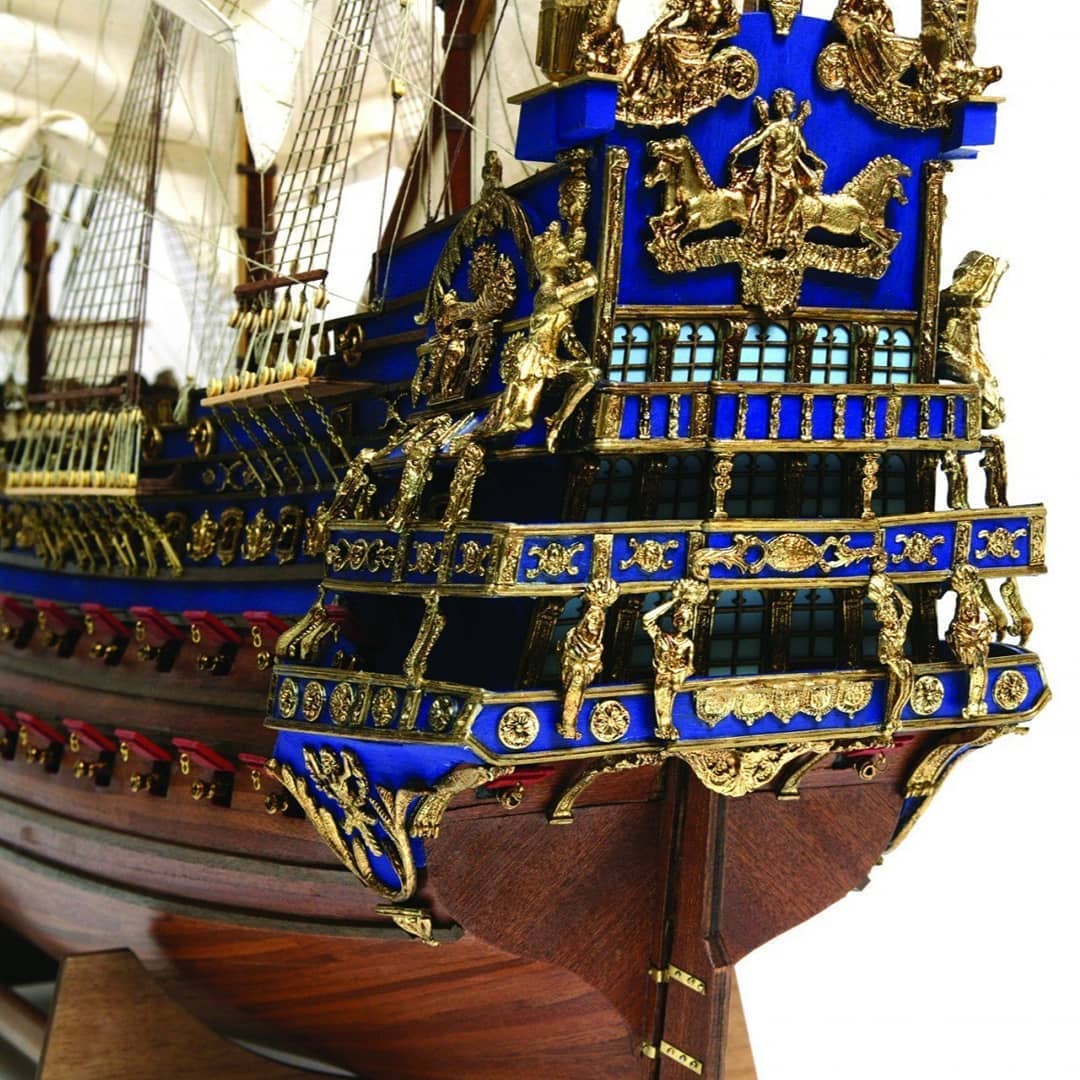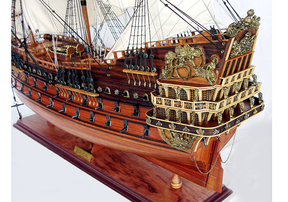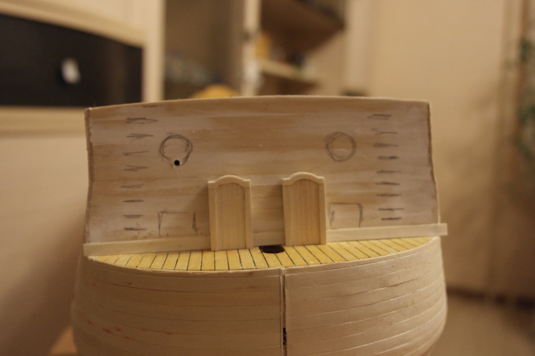 Начнем работу над носовой переборкой. Посмотрим, как это было на самом деле (фото из Лувра ) и то, что нам предлагает ДеА. Во-первых нижние пушечные порты не могут располагаться так близко к борту, т.к. расчету орудия будет там не повернуться. Соответственно сдвигаем их к бушприту, а трапы делаем по другую сторону порта. Как следствие, выходы на гальюн должны быть расположены ближе к бушприту. Во вторых на верхней палубе ДеА нам предлагает какие-то иллюминаторы. Зачем они там? На модели из Лувра там пушечные порты. Поэтому там сделаю круглые порты и их только два.