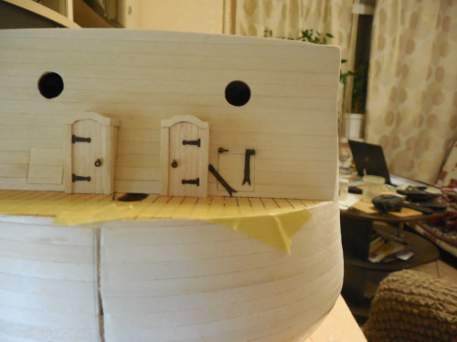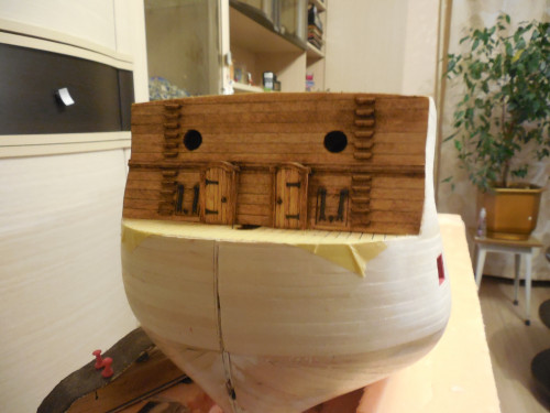 Согласен, что это не верно. Мало того, судя по фото модели из Лувра, бушприт входит не в палубу, а в переборку. Я побоялся столь глобальных изменений. Пришлось бы переделывать княвдиггет, декор и т.п. Это мой второй кораблик всего лишь. Поэтому не буду так кромсать набор. Оставлю по центру.