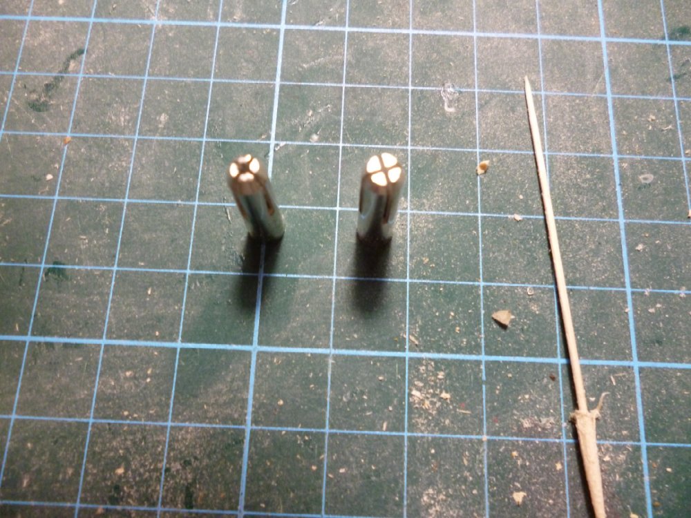 Взял от китайской сверлилки две цанги - побольше и поменьше. Зубочистку зажимал в бормашинку и калибровал сначала большим диаметром, затем меньшим. После маленькой цанги зубочистка получалась чуть тоньше 1 мм. Дальше обработка наждачкой. Получается намного быстрее. Цанги и результат обработки на фото. Зубочистку в палубу вставлял снизу. Так нет клея на палубном настиле и меньше шансов расколоть доску настила, т.к. нагель имеет не конусобразный конец, а подогнан точно в размер отверстия. Проще будет обрабатывать.