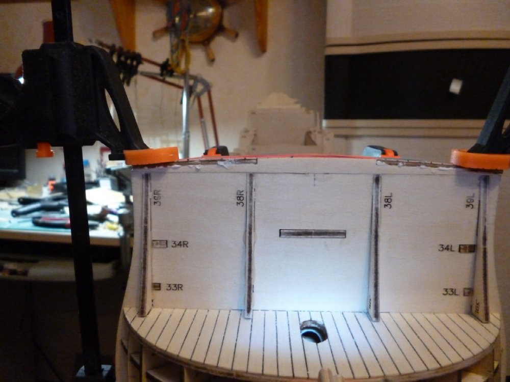 . К сожалению, все так же не хватает времени, поэтому движемся уж очень медленно. Смотрел в группе по Солею в VK, там человек уже порты прорезал и чистовую во всю делает. А у меня все еще с палубами возня. Вот сегодня установил на место опердек (кажется правильно назвал). Делал все аналогично фордеку. Сначала склеил две половинки палубы обрезками фанеры, затем выпилил шаблоны, приклеил к палубе