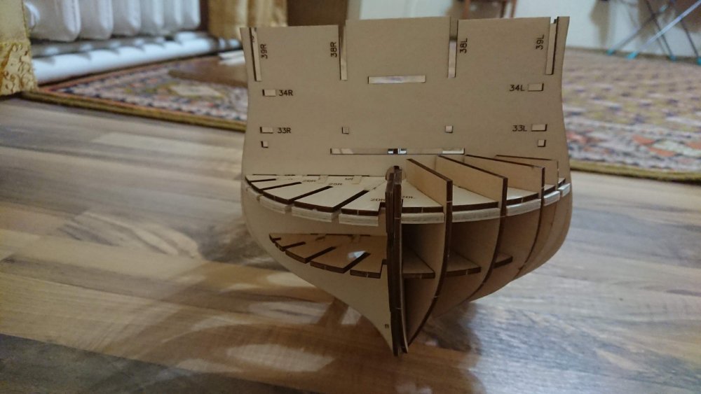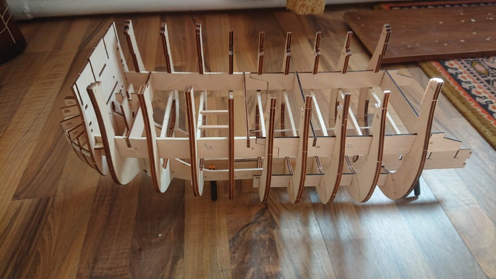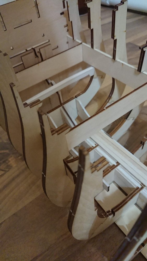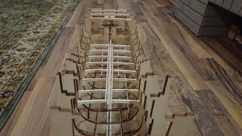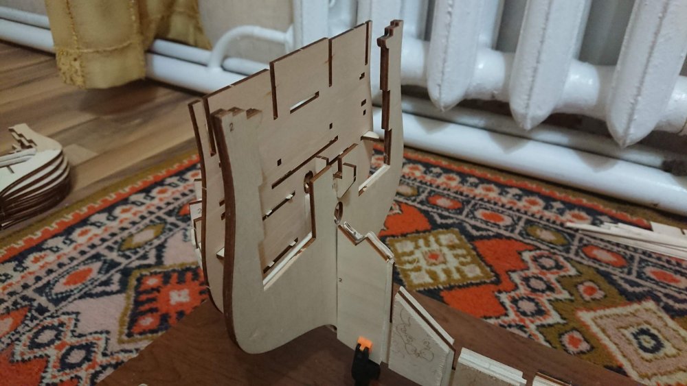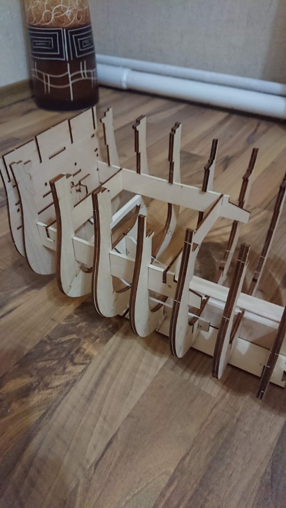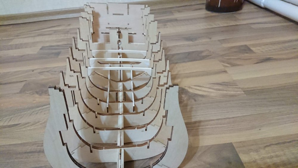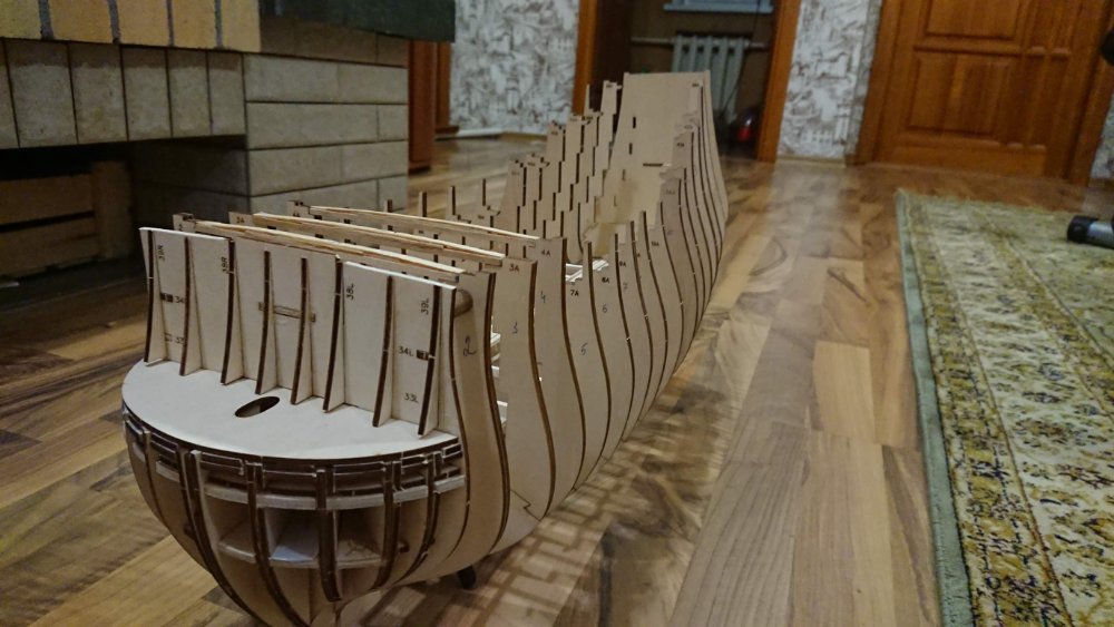 Добрый вечер.Андрей Евгеньевич на данный момент тоже усиливаю шпангоуты и килевую рамку с помощью школьных линеек до 6 мм.Сборка происходит на "сухую" до получения всех деталей корпуса.Мне интересно будете ли Вы внедрять в килевую рамку закладные, (мебелью фурнитуру) если да , то в каких местах(между шпангоутами ?).Будете шпации заполнять каким либо материалом? Палубный настил укладывать реками из журнальный серии или покупные?Интересно узнать размеры декоративной подставки под наш корабль?Шлюпку будете делать из партворка или искать подходящий кит набор с лазерным раскроем?За ответы заранее благодарен!!!