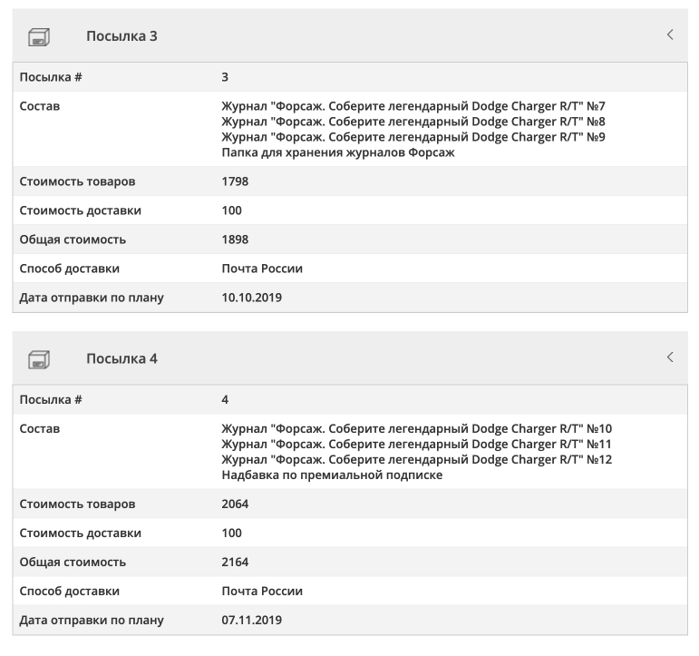 У ДеЛореана шесть номеров чуть ли не в два раза меньше весят, посылка №№21-26 вес 421 г. А тут у нас всего три номера.Юрий Тарасов писал(а): ↑06 ноя 2019, 16:11 Пришла 3-я посылка)) Теперь понятно некоторое возмущение блогеров. Из этих 3 выпусков можно было сделать 2, а то и один большой... Если первая посылка была 1,61 кг, то 3-я - 830 г...