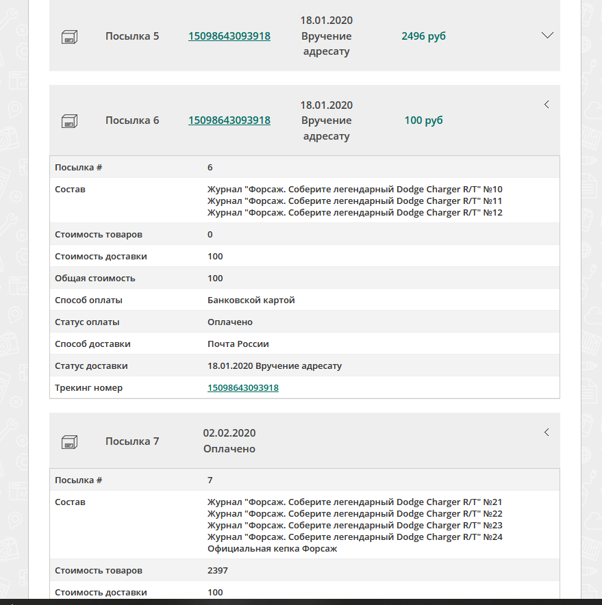 В чеке на оплату номера 10-12. Так что это скорее всего опять глюки ЛК.Юрий Тарасов писал(а): ↑02 фев 2020, 16:33 ЛК как обычно... Сумма 2164 как за номера 10-12, а там посылка №6 №№21-24))) Статус "Оплачено", но там сумма 2853. Завтра писать и уточнять надо.