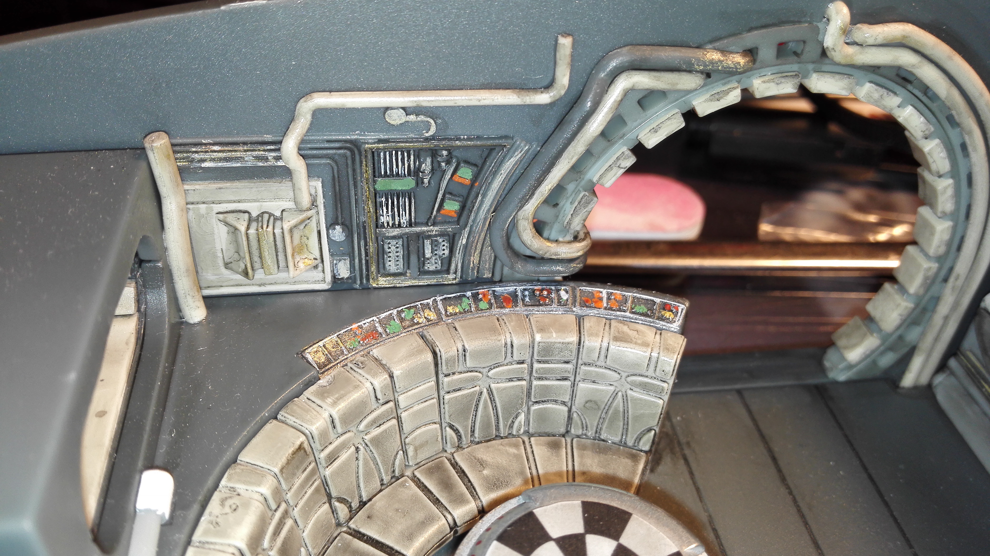 В принципе, покраска внутренней стороны коридора - один из способов доработки модели. Вкладки достаточно хорошо блокируют свет от диодов, но в районе первой пары монтажных штифтов (возле переборки, где мы вырезаем уголки) свет будет просматриваться. Их точно можно густо прокрасить в нижней части, прилегающей к внутренней поверхности рукава (штифты полностью красить не рекомендую, иначе будет сложно вставить их в гнезда). Что касается остальной части рукава, то ее тоже можно покрасить изнутри где-то до поворота. Но с этим можно повременить и дождаться этапа монтажа интерьера коридора, который будет просматриваться через съемную панель, чтобы понять, до каких пор имеет смысл красить.