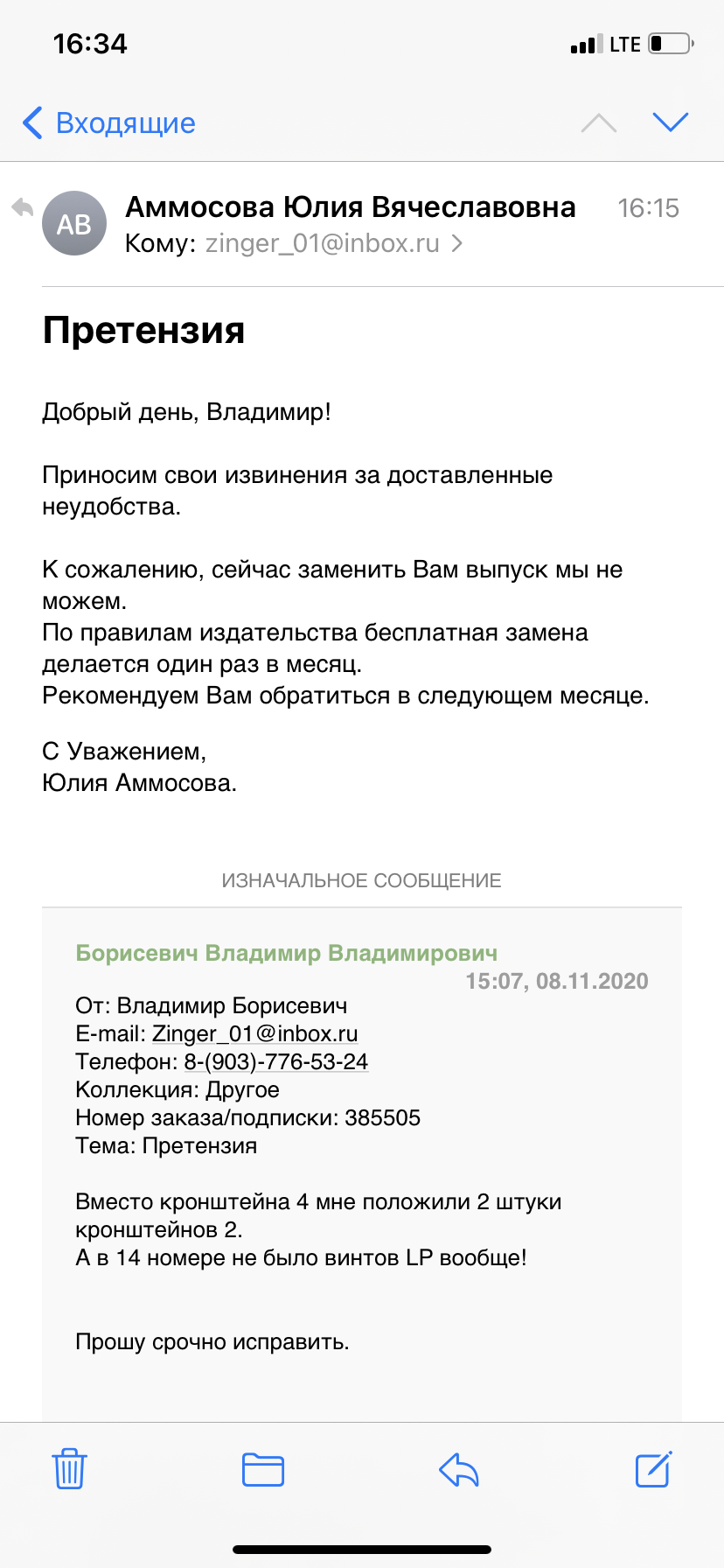Вот такая курьезная ситуация. Подписка 385505. 8 ноября я оформил претензию по поводу последней посылки. 3 из 4 номеров были некомплектными. В одном не было винтов LP, думаю бог с ним, взял из другого номера запасной. В 15 номере было 2 кронштейна номер 2 вместо 2 и 4. в 16 номере нет корпуса буксирочного прибора. По факту 75 процентов брака/некомплектности.