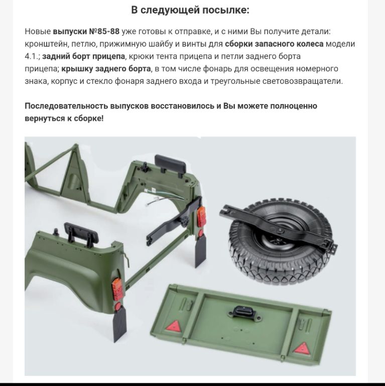 Скажу больше, дальше идёт посылка с номерами 113-116. Администрация форума молчит.FeHa3eIIaM писал(а): ↑23 авг 2022, 07:07 Получил письмо, в котором сказано, что "После посылки с выпусками №101-104, последовательность отправки посылок восстановится, и Вы сможете полноценно вернуться к сборке Вашего УАЗа". Однако в личном кабинете анонсированы следующие посылки с номерами 105-108 и 109-112. Когда всё-таки восстановится последовательность отправки посылок?