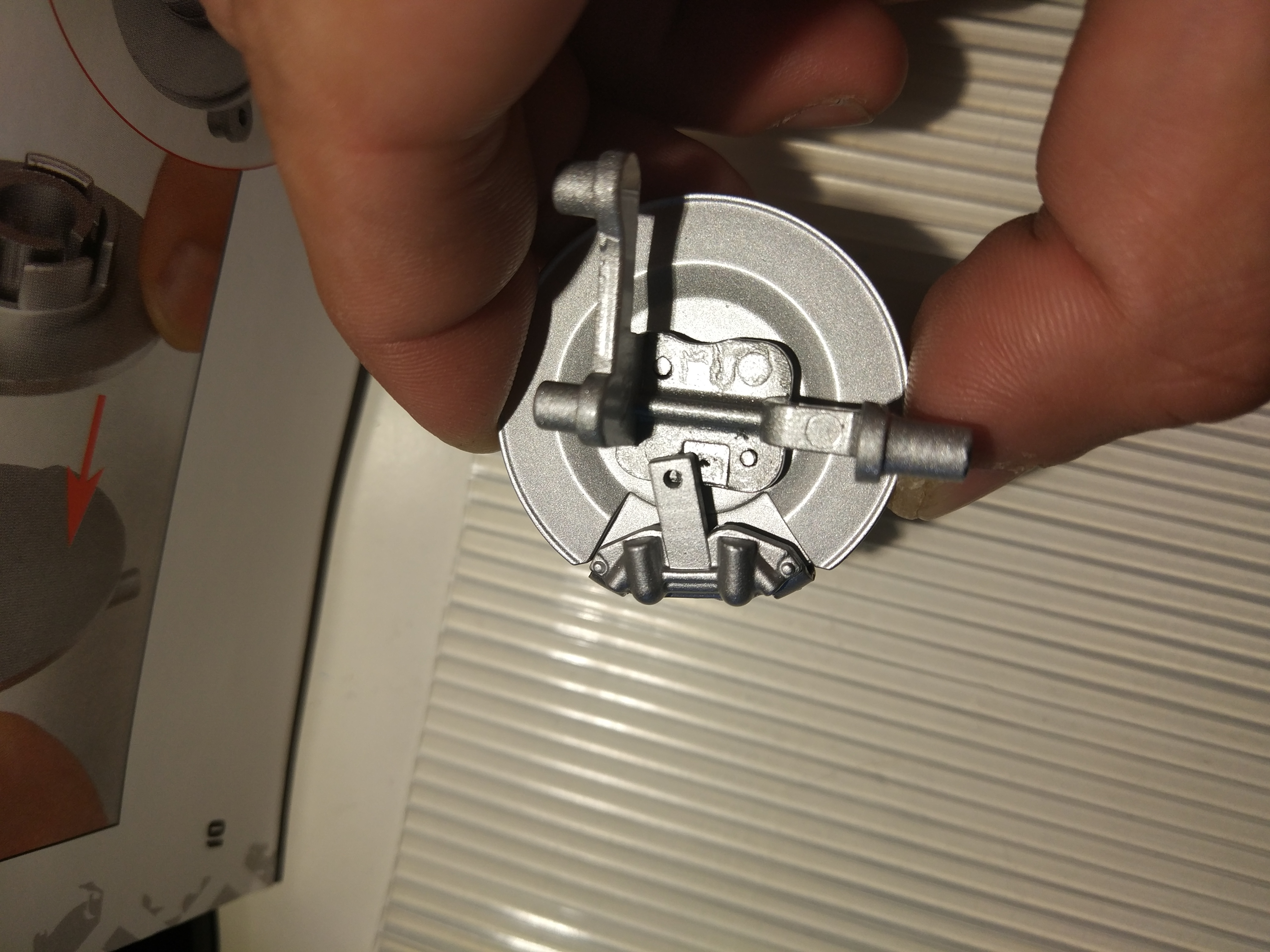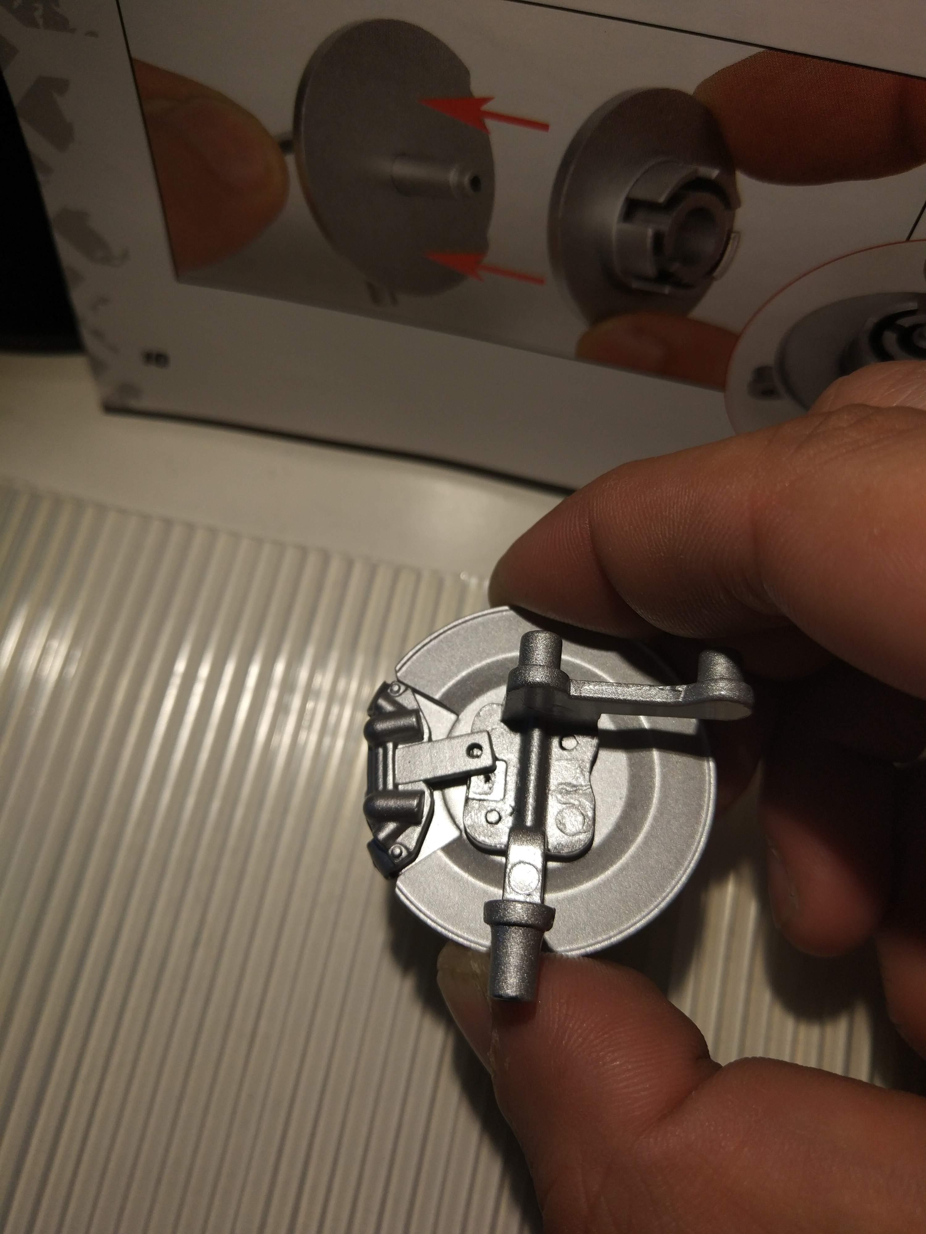 3. С колесом получилось очень легко: положил в металлическую миску, залил кипятком из чайника, подождать 2 минуты, вытащил кулинарными щипцами, протёр бумажными полотенцами и спокойно, не спеша, запихнул сначала половину диска, затем выправил края покрышки и окончательно собрал колесо. Не Lego, конечно, но сильных сложностей не испытал, силу особенно применять не пришлось.