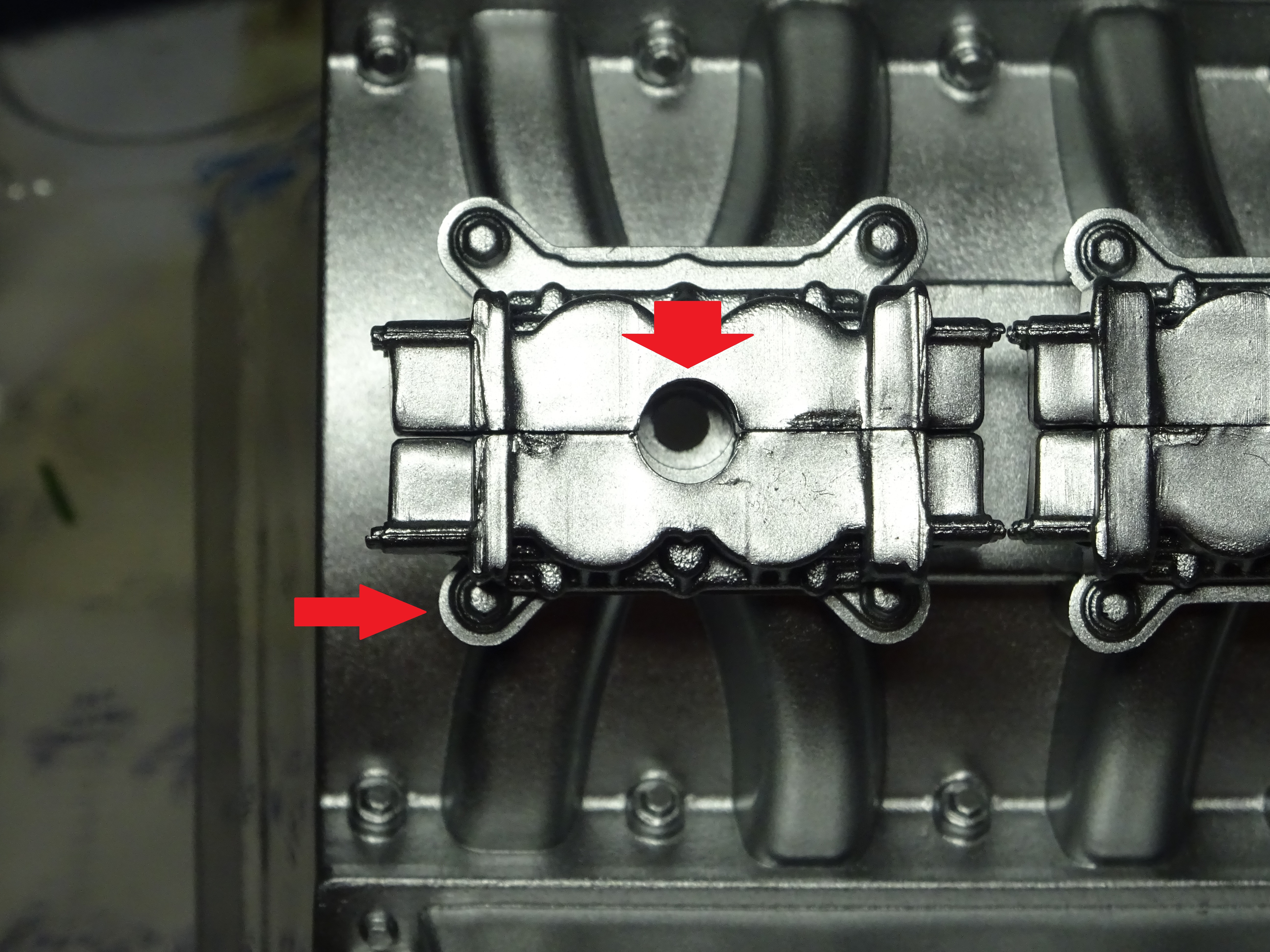 Если у вас также, то нужно аккуратно без усилий (оно приклеено на краску вроде) отделить тонким скальпелем или лезвием и снять с плиты основания карбюраторов и перевернуть их таким образом, чтобы все отверстия совпадали, тогда у вас встанут карбюраторы ровно и фильтр на свое место сядет легко без усилий и всё будет сидеть чётко по центру.