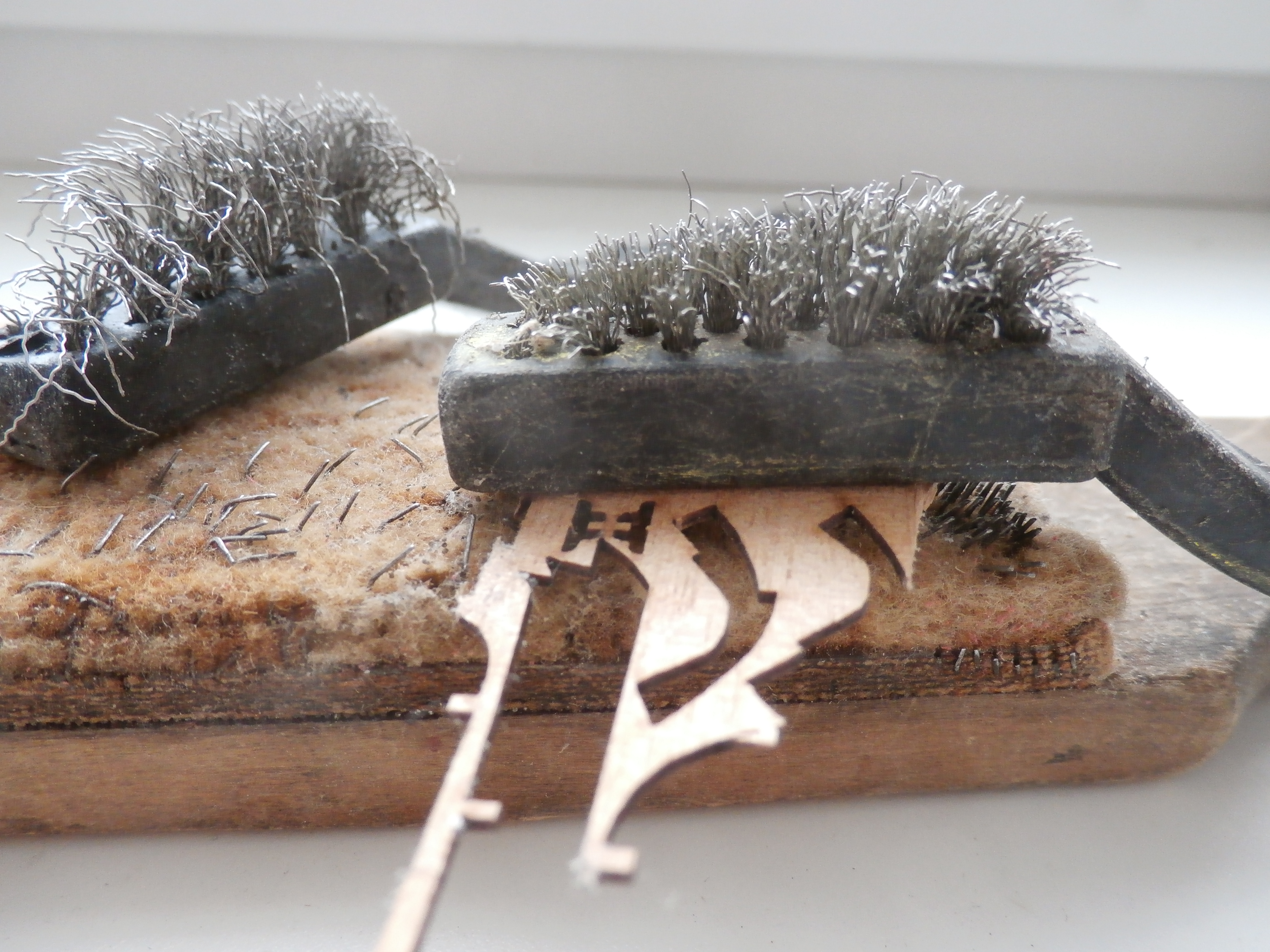 Для очистки "забитого " напильника, надфиля были придуманы кардщетки. Щетка с стальной щетиной. У меня сохранилась такая, правда от интенсивной эксплуатации и долгих лет жизни практически "беззубая", но как ни удивительно она всё еще справляется со своими обязанностями, хотя с грехом по полам. Китай предлагает мини кардщетки с пластиковыми ручками по виду похожими на зубные щетки с металлической щетиной. Правда к сожалению длинная щетина практически сразу же "сваливается" в комок и перестаёт выполнять поставленную перед ней задачу. Советую после покупки такую щетку подстричь как можно ниже ножницами "по металлу" и тогда она будет вам нормально очищать ваши надфили и напильники. Полностью согласен с автором: для успешной работы с деревом предпочтительные так называемые "алмазные" надфили. У них выше КПД! Для металла все же лучше обычные "классические - стальные. При долгой работе насечка на надфиле стирается, но советую их не выбрасывать особенно те, что из времен СССР. Хорошая сталь! Из них получаются не плохие по качеству мини резцы, мини стамески. В будущем вам потребуется мини инструмент для работы с судо моделями различной формы и размеров. И последнее: Многие, ошибаясь, хранят свои надфили в продолговатых коробочках "навалом", часто даже с различными сверлами Что очень плохо сказывается на "здоровье" вашего" инструмента! Насечка, лезвия инструмента тупятся и и безвозратно стареют... Каждое сверло, каждый надфиль должен иметь своё персональное место! Не касаясь своих товарищей! Хотя бы в том "фирменном" полиэтиленовом футляре, в котором вы купили его в магазине. Удачи всем вам и конечно Здоровья!