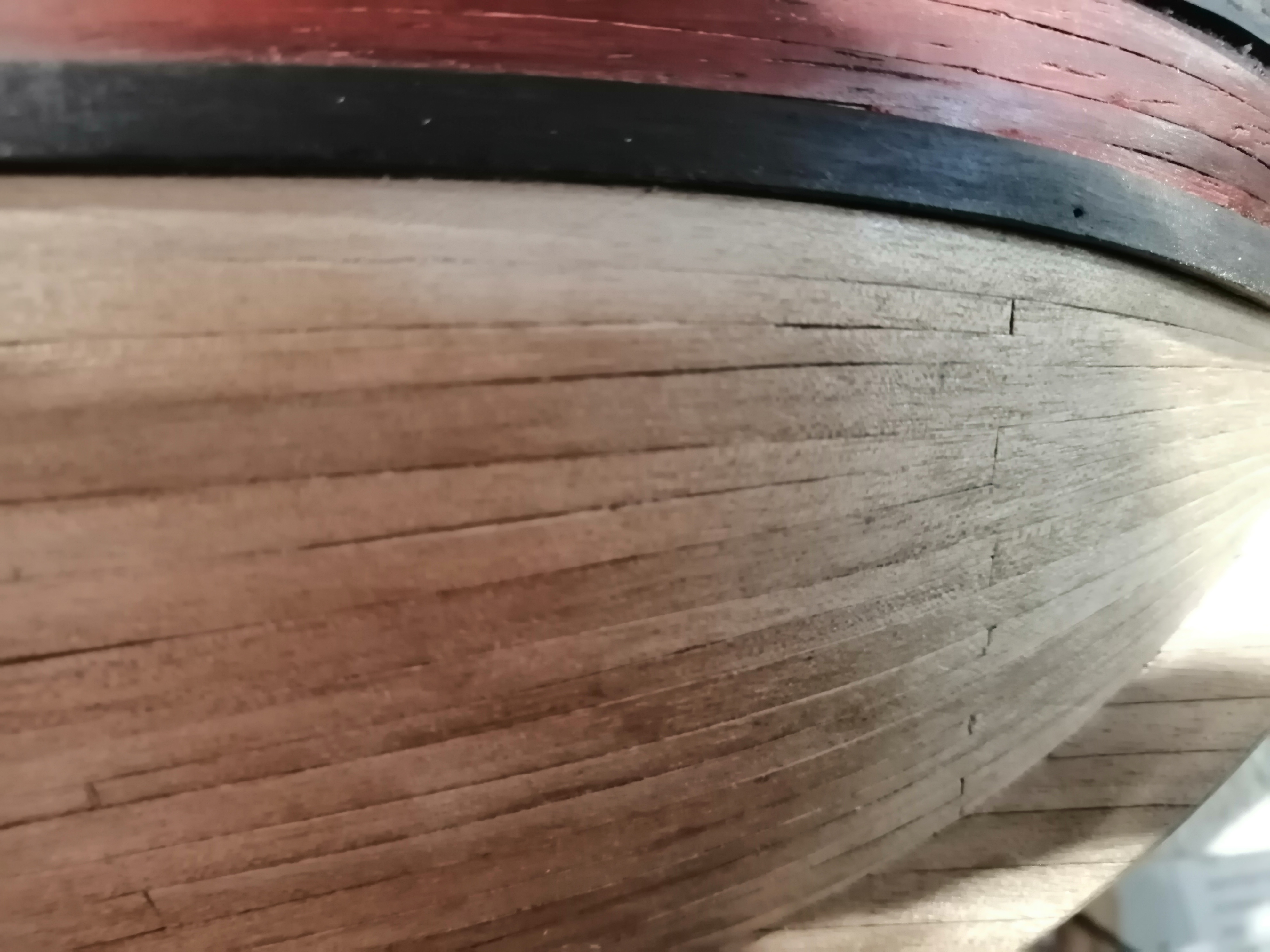 На фото корпус Виктори, ему наверное уже лет десять. В своё время был прошпаклёван, но зимой при включении отопления, начал рассыхаться " ? ". Зашпаклёван ещё раз, замазаны все места где разошлись планки. После шпатлёвки всё изнутри и снаружи промазывалось разведённым клеем. Сразу оговорюсь, планки были приклеены не только к шпангоутам, но и склеены между собой по торцам. Да так и стоял в этой поре, пока не "утонул" в прошлом году(вернее утонул не корпус, а дом). Отправился отлёживаться на чердак - вот результат через год. Всё же первая обшивка "гуляет" при перемене температуры и влажности.