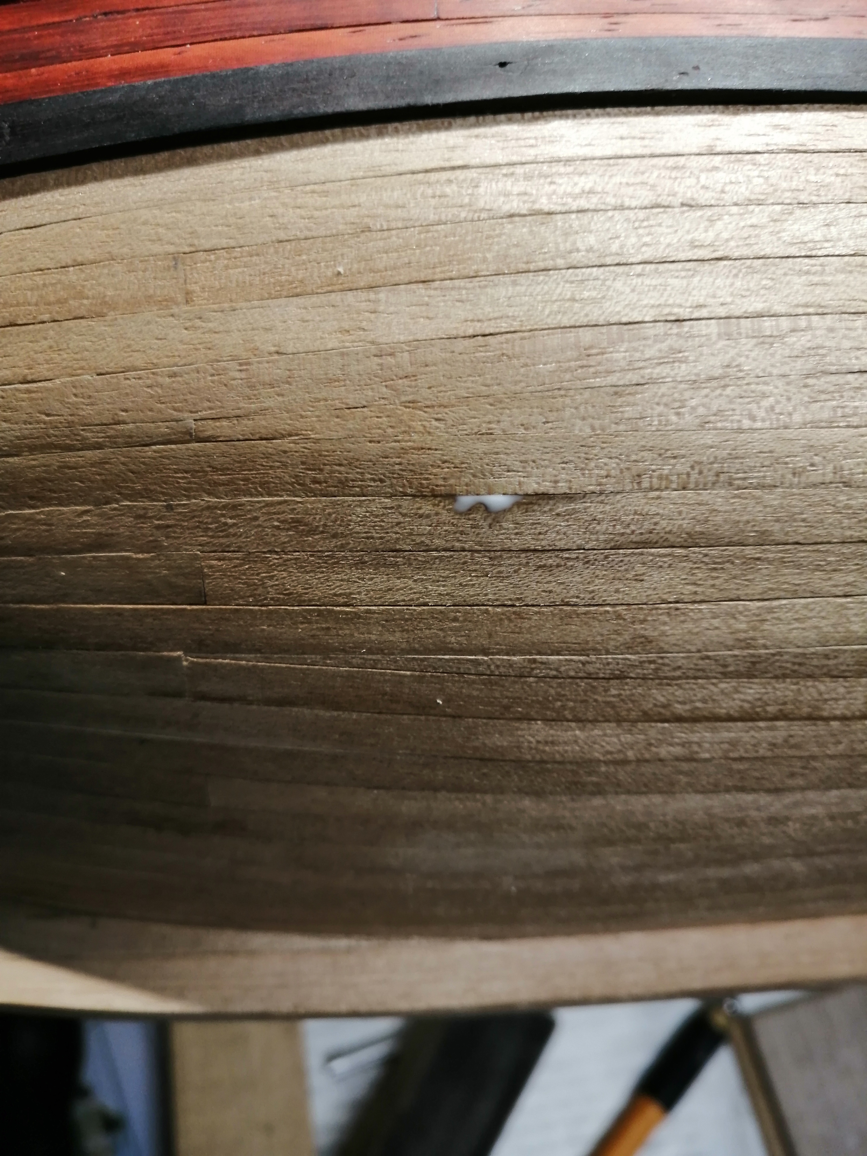 По той же причине, что корпус Виктори, корпус Соверена тоже постоял в относительной влажности, но на нём двойная обшивка и стоял он в доме. Всё же без ремонта не обошлось. Появились пустоты под планками, так называемые "чижи". Это происходит не только от перемен влажности температуры, ещё если при "приваривании" планок утюжком и пр., пересушить клей, а там уже вступают внешние воздействия. Конечно лучше при этом способе склейки, держать под рукой фен (пока супруга спит), поставленный на "холодный" воздух, без подогрева. Планку после приварки лучше охлаждать, хотя многие этого не делают. Если поверхности не большие, или стырить(заполучить) фен не удалось, можно охлаждать прижатием пальца, пока не остынет. Хотя в этом способе есть что то от мазохизма, думаю более удачное решение, чем при добыче фена заполучить скалкой, которая ещё на рейки не распилена :lol: