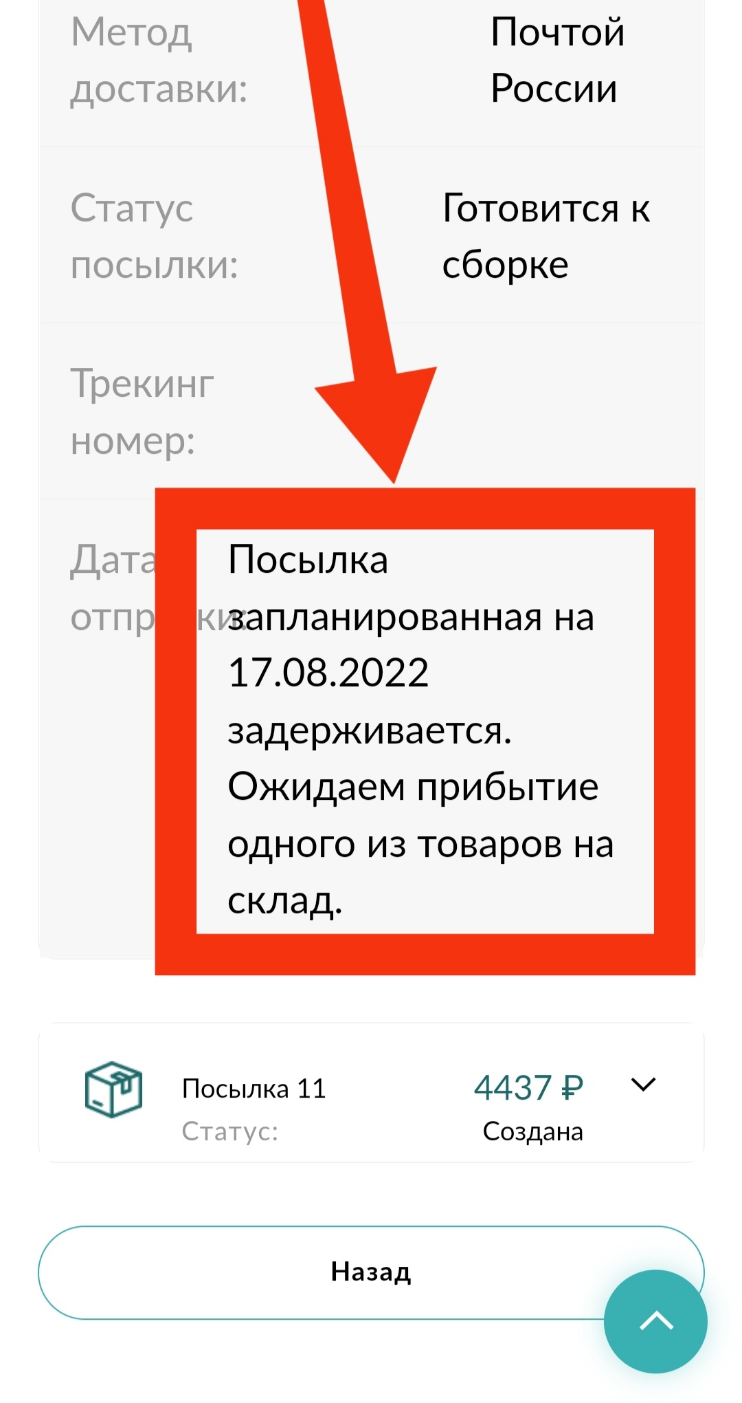 sersir писал(а): 29 авг 2022, 21:57 У меня вопрос к издателю или к администратору... в личном кабинете висит банер "Посылка запланированная на 19.08.2022 задерживается. Ожидаем прибытие одного из товаров на склад"...