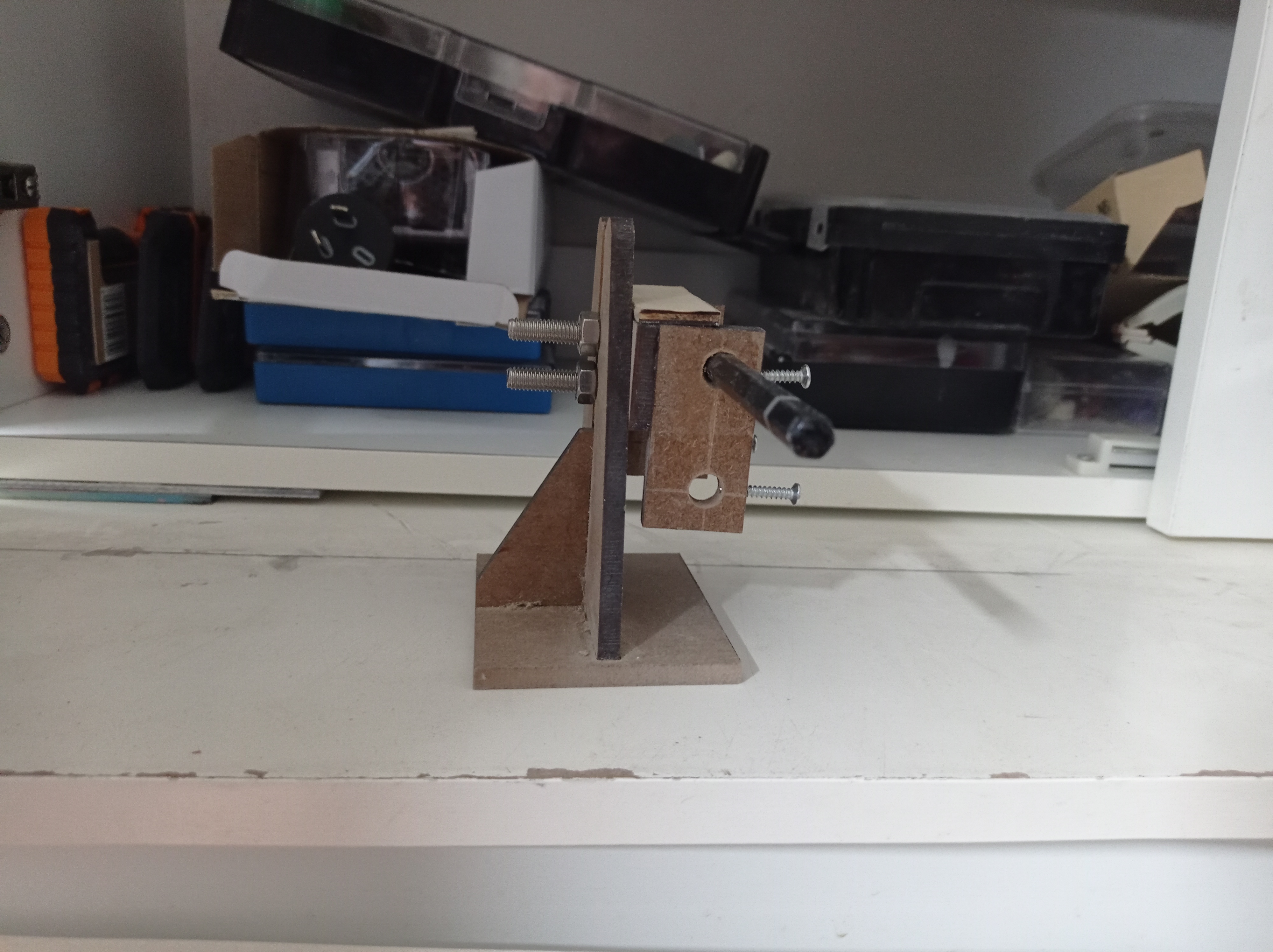 Кусок плиты или фанеры как основание, на неё перпендикулярно крепите линейку (можно даже штангель) и уже к линейке на нужном уровне крепите (привязываете, приклеиваете) любым удобным вам методом карандаш. Вот вам и спецприспособление. Для того, чтобы один раз провести линию большего и не надо.