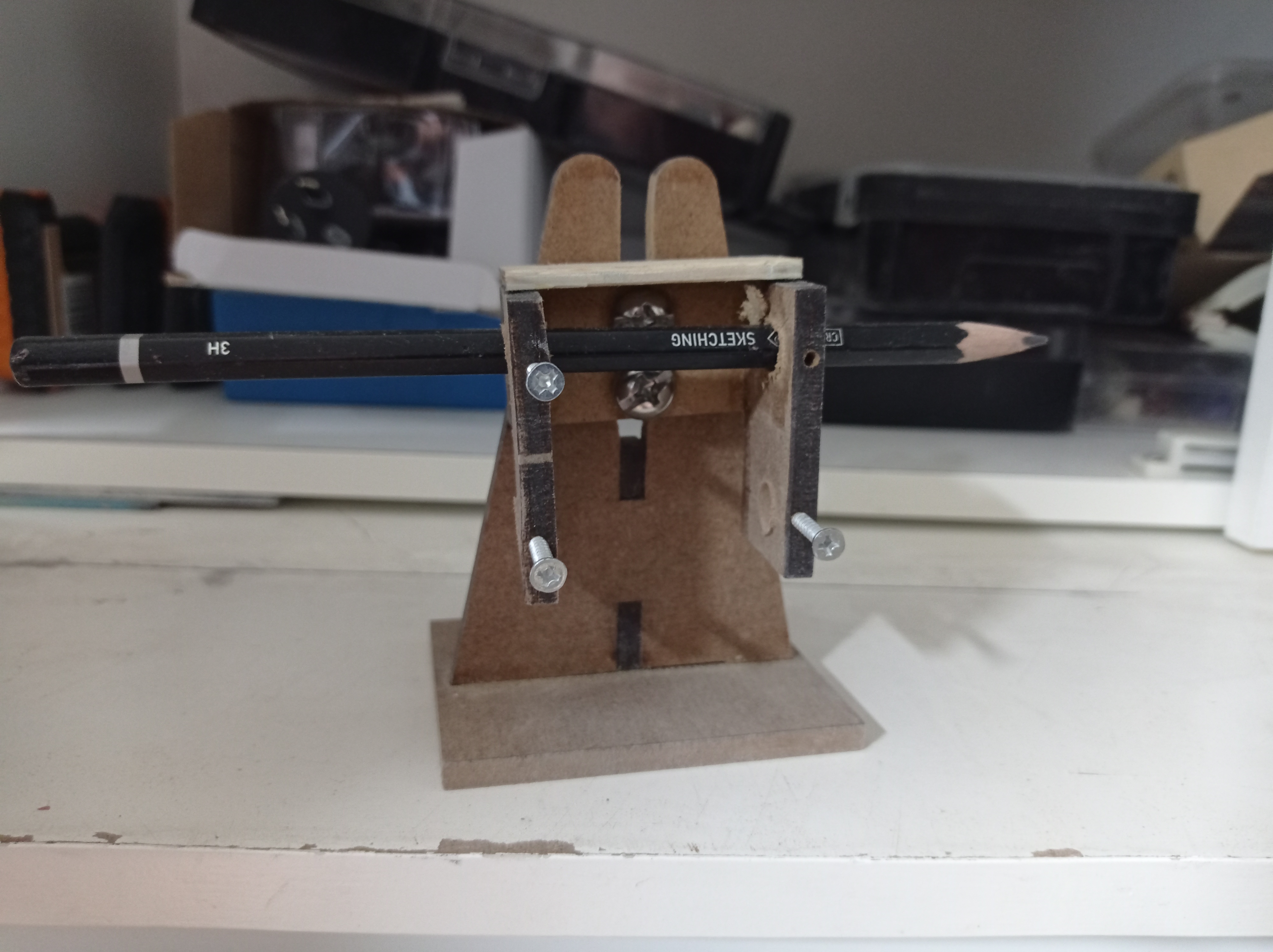 Добрый день! Собственно, вам уже ответили на ваш вопрос. Самое простое в изготовлении устройство предложил Oldman. Если вы не хотите ничего изготавливать, просто воспользуйтесь какой-либо подставкой, позволяющей расположить карандаш на нужной высоте. Очень часто советуют использовать блок листов для записей - удаляя или прибавляя листы, удобно регулировать высоту карандаша.