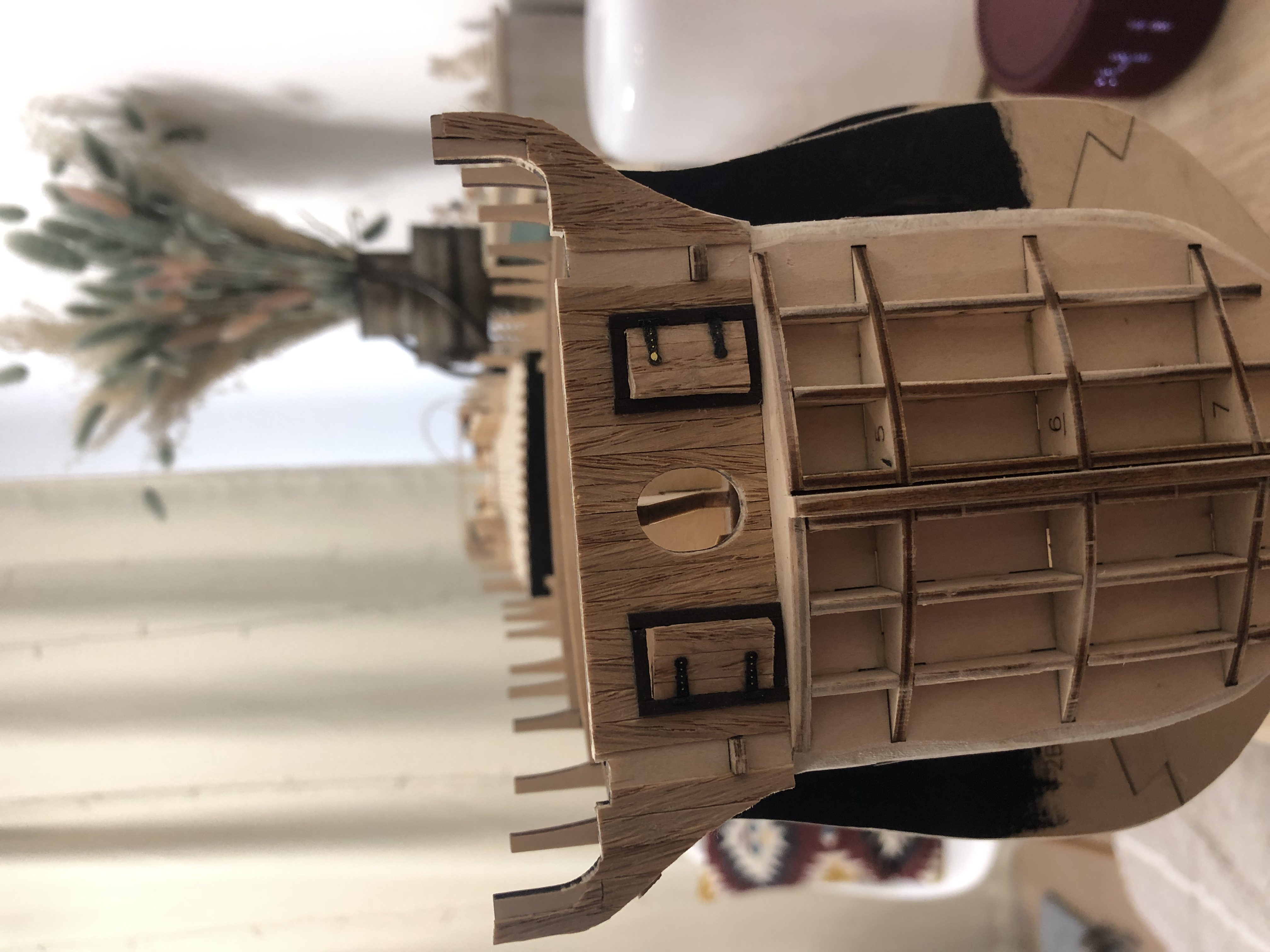 Верхняя палуба. Здесь вариантов не много. Заморить верхнюю палубу морилкой. Лучше конечно морилкой цвета эбеновое дерево ( черный цвет ) Но в принципе и любой другой темной морилкой ( "Махагон", "Мокко"др. ) И после просушки настелить еще один слой новой палубы. От этого модель не пострадает - лишь увеличится конструкционная жесткость корпуса модели, но к сожалению и это добавит расходы на строительство вашей модели. Подумайте, возможно мой пост направит вас к творческому мышлению и вы придумаете что то ещё, но не унывайте, не опускайте руки, в любом случае строительство модели корабля это обязательная цепочка больших и малых загадок которых требуется решить. Вспомните из литературы:" Ай да Пушкин! Ай да сукин сын!!!" Удачи Вам и конечно Здоровья!