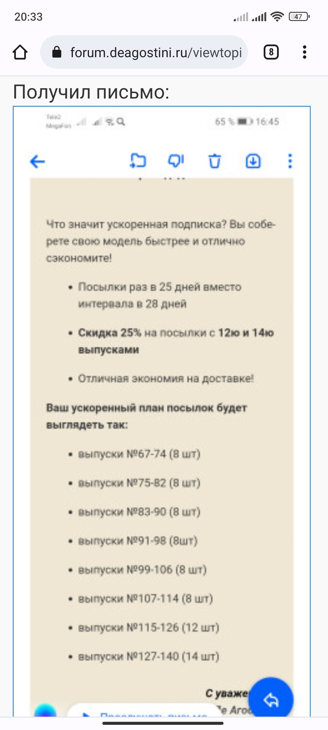 Я подписалась сразу как только был первый анонс коллекции! И почему такая разница в посылках? Мне 18 должны отправить в мае, притом последние будут без скидок и по 8 номеров, 20 - с 10 вроде бы. Уважаемый издатель может пояснит???
