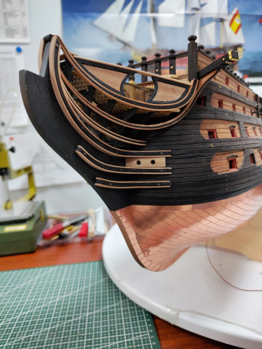Добрый день всем, кто строит СТ. Установил все руслени. Те которые были в наборе использовал как шаблоны. Изготовил из черного граба. Вопрос ко всем , кто уже занимается такелажем на СТ. Есть ли на русленях рым болты, а если есть то где они расположены. В инструкции я что-то их на русленях не нашёл.