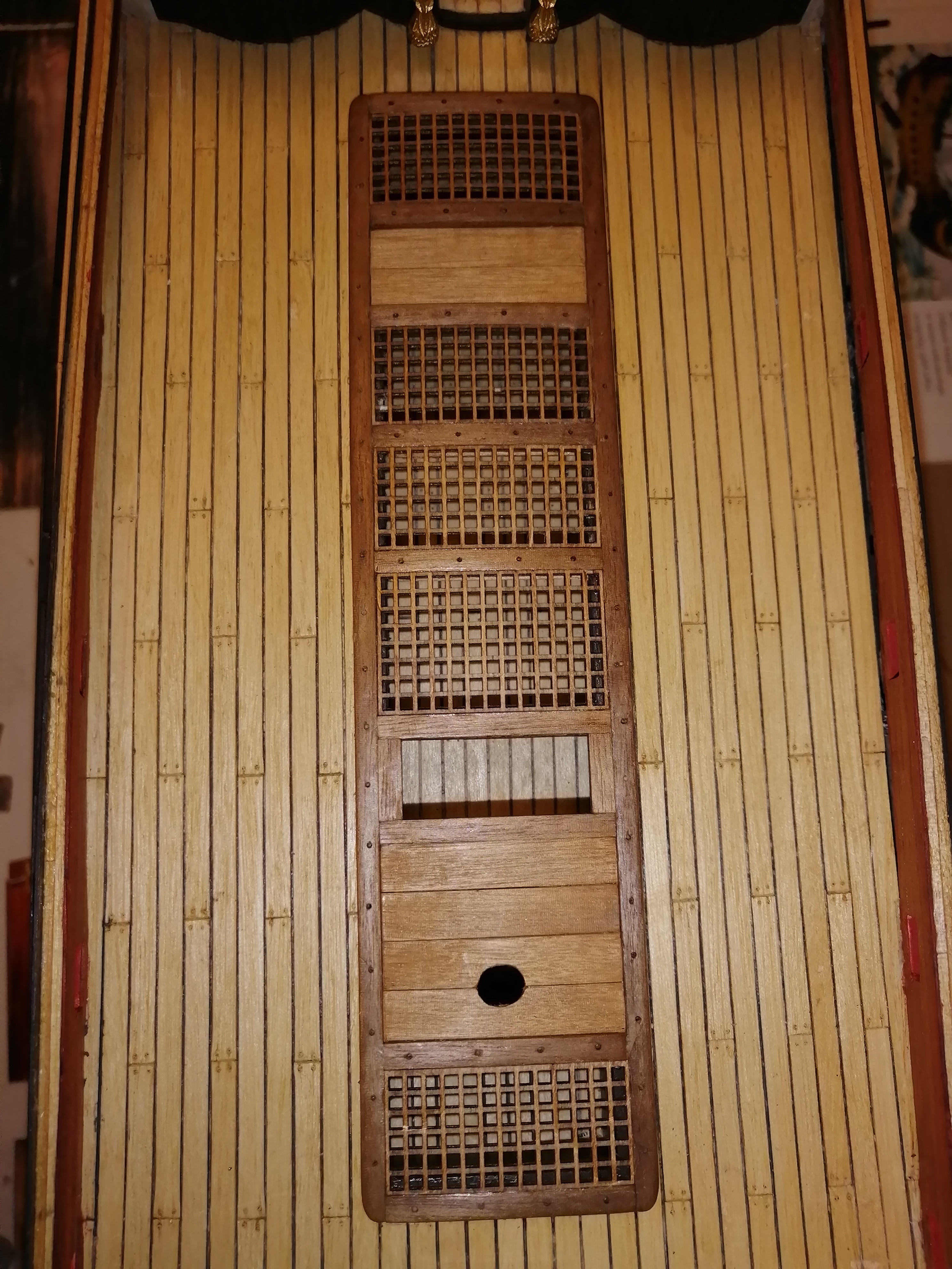 Полностью с вами согласен. Экспериментируйте! Судомоделизм - это одно из направлений искусства! В помощь в работе с палубой вашей модели отправляю два фото из интернета. Фото современного барка "Крузенштерн". Флот консервативен и думаю что и сто и двести лет тому назад все также доски палубного настила на стыках и по краям конопатили пенькой, а по верх заливали варом. Во круг судовых устройств на палубе укладывали рамки (нижн.фото. Рамка во круг кнехта ) Из своего опыта, что бы показать конопатку досок, я предварительно наношу на края планок продольные полоски перманентным маркером. Удачи Вам и конечно Здоровья!