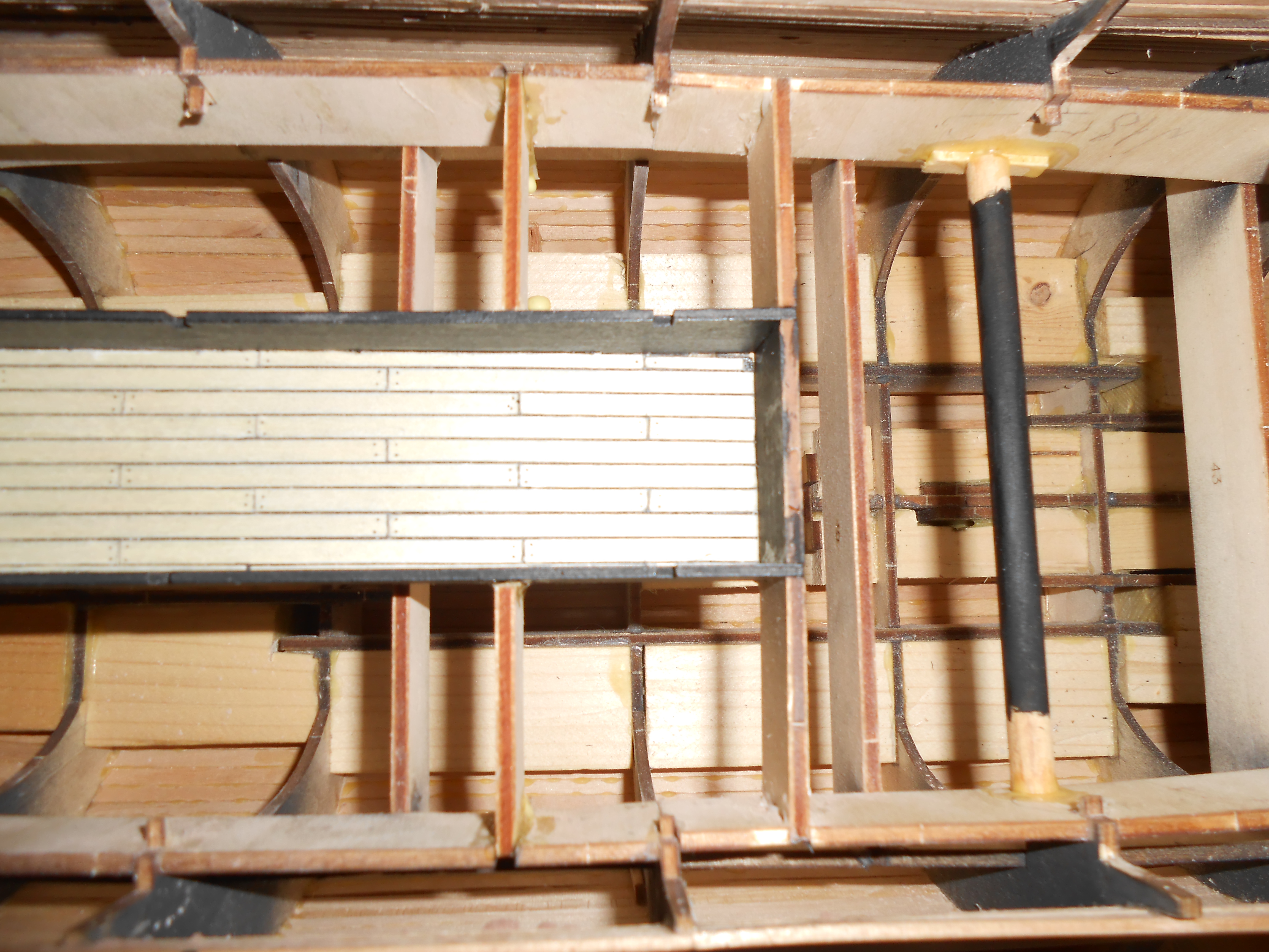Сегодня при сборке сталкнулся с такой проблемой, когда начал клеить вторую палубу, рейка не ложится на последний бимс. Она буквально касается его. Решил нарастить бимс и приклеить. Весь каркас собирался без проблем на стапеле. В дальнейшем я думаю горе хапну. как думаете эти 2-3 мм в дальнейшем помешают сборки?