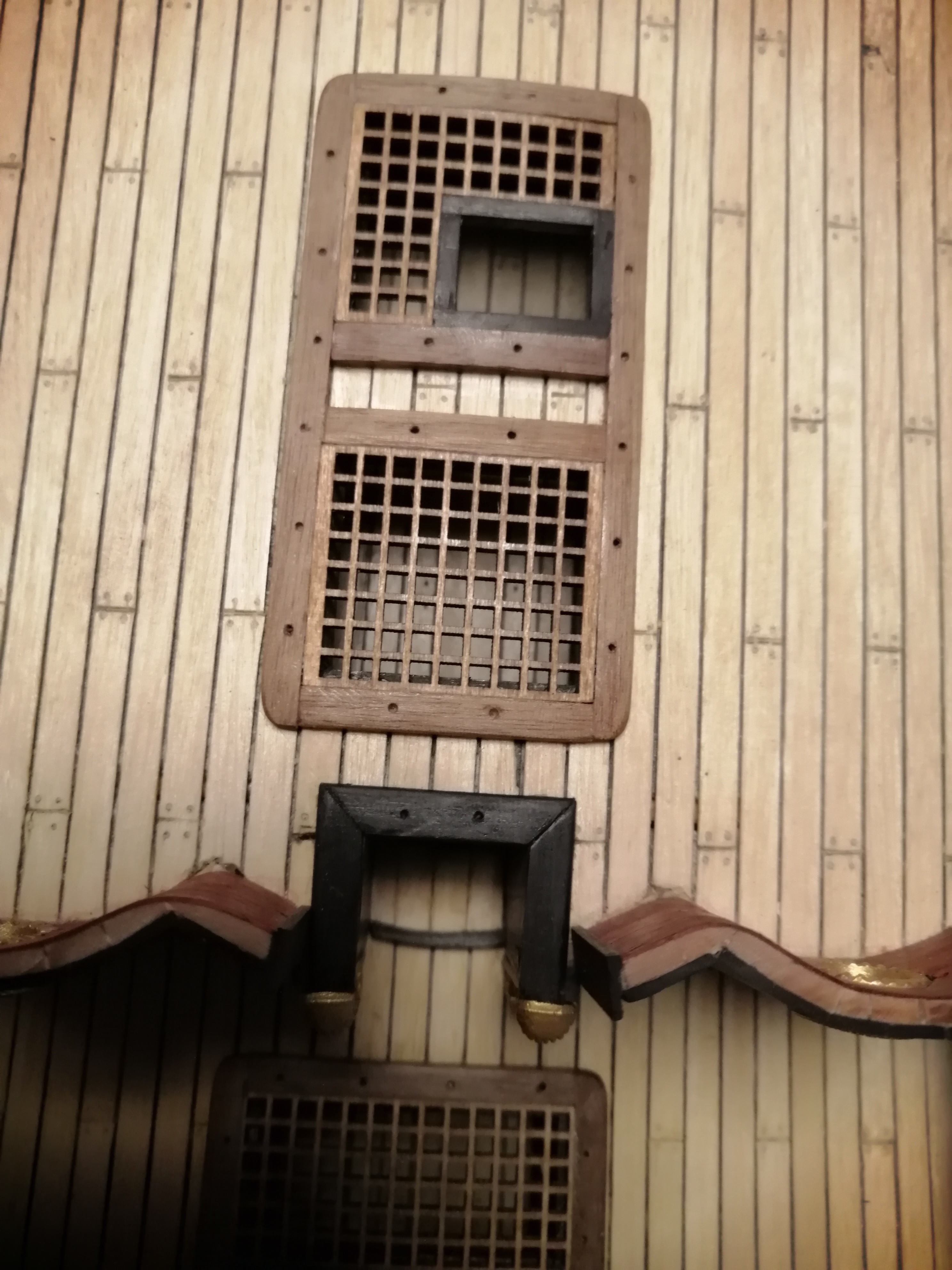 Удобно сверлить сверлом 0,5мм или 0,4мм. Но зубочистки лучше точить и ставить внатяг без клея. А нужно ли делать полную имитацию по бимсам?