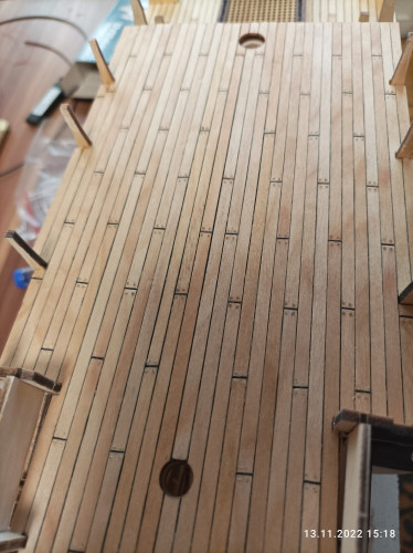 Следующую палубу стелил из реек, предложенных журналом. Разметку делал нитками, как и на бумажной палубе, но монтировал по другому. На каждую рейку с одного торца сначала клеил нить, потом склеивал рейки между собой уже через нить. Продольные швы имитировал просто пропиливая не глубокую канавку трехгранным надфилем и вклеивал туда кусочек нити. Гвоздевал так же зубочистками. Обе палубы, после обработки наждачкой, обрабатывал льняным маслом. Видимо из-за разницы в породе дерева реек оттенок получился разный у палуб. Со временем разница становиться менее заметна, но все равно есть. Но думаю не критично это, в последствии палубы будут заставлены частично, да и такелаж отвлекает на себя внимание... По опыту из всех гостей, кто приходит ко мне в гости на палубу вообще мало кто смотрит( Всех общий вид корабля уже поражает. Детали важны лишь мне) Хотя разница в оттенках конечно слегка расстраивает...