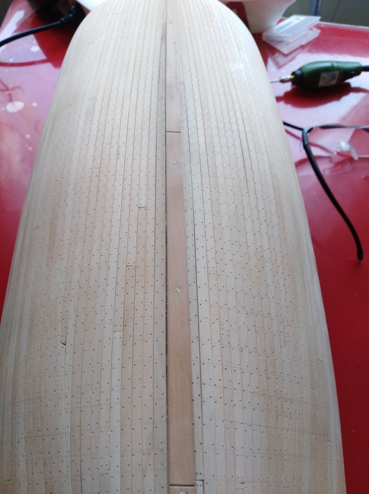 Вы к сожалению не разрезали на "доски". Мы понимаем, что длинна доски около шести метров(+-), умножаем на масштаб, например - 0,85, получаем = 7см.(примерно). Раскладываем доски в две, три, четыре(но это более поздний период). Раскладок палубной доски здесь приведено не мало, повторяться не буду. В Вашем случае, только продавливать(например острой плоской отвёрткой), без фанатизма. На стыках досок два параллельно торцу каждой доски, всего четыре, на воображаемых, расчётных, или предполагаемых шпангоутах, на искосок с разбежкой, + один диаметр. Пример - ДУ сверла 0,5мм., следующее отверстие через один миллиметр(центра). От лени можно делать меньше нагелей, но на стыках досок - обязательно. Пример - хотя бы так viewtopic.php?f=242&t=1568&p=75222#p75222